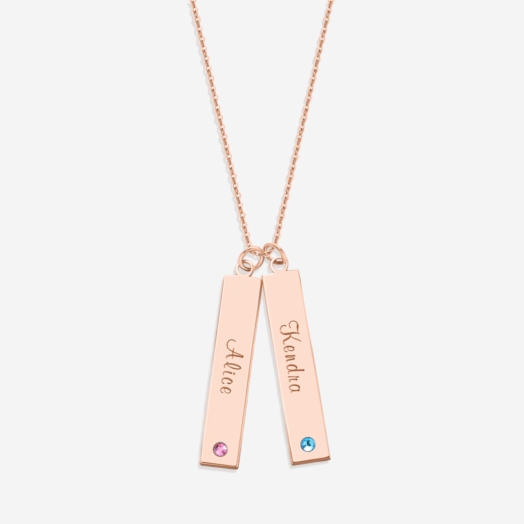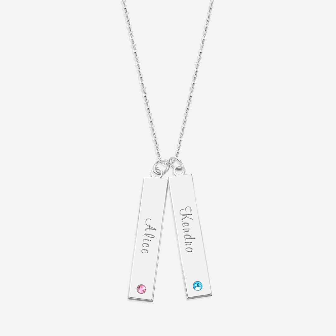 This elegant piece features a bar pendant that can be engraved with a name, making it uniquely yours. The pendant is adorned with a carefully set birthstone that adds a splash of color and personal significance. Perfect for celebrating one's own birth month or as a thoughtful gift, the necklace offers a modern way to wear something both meaningful and stylish.