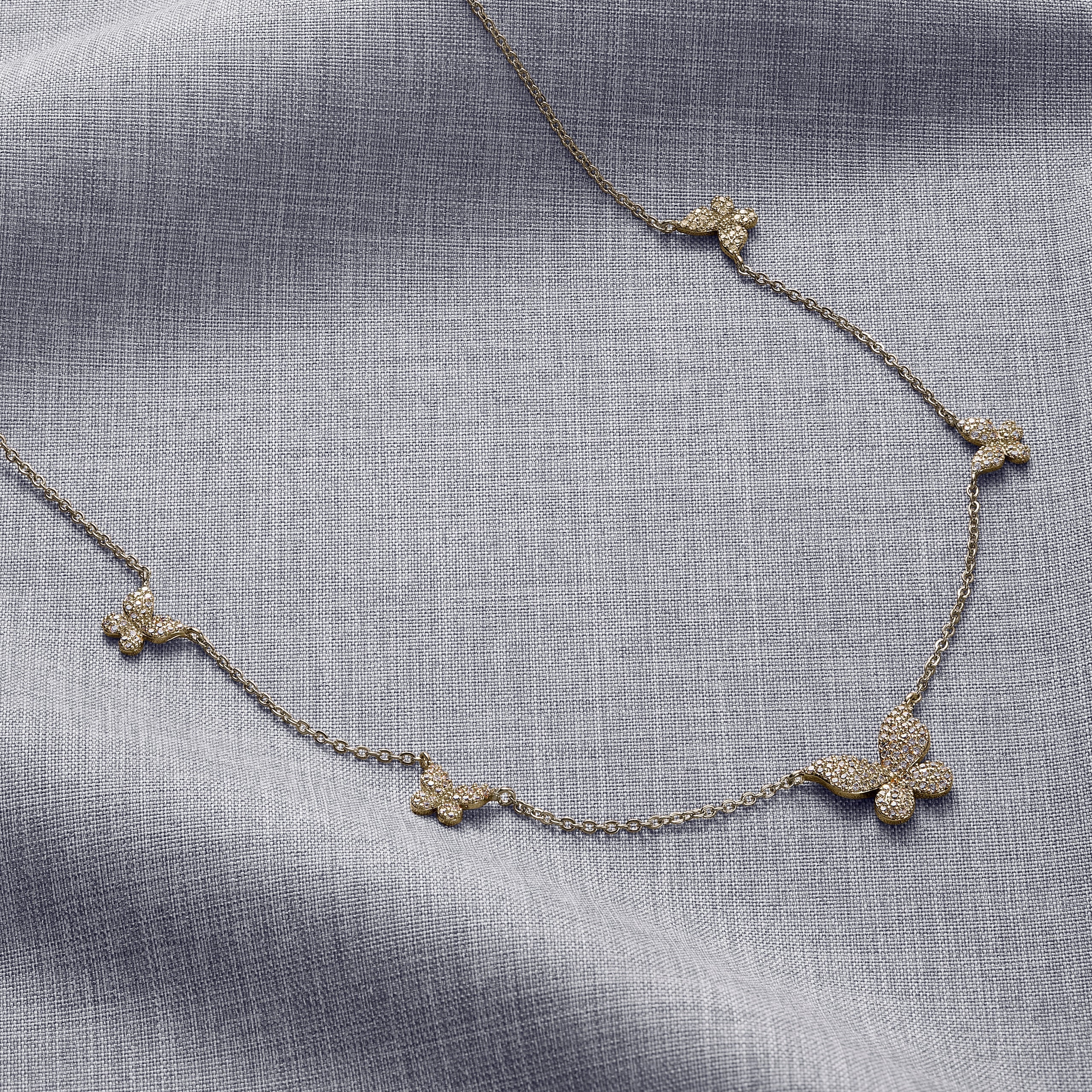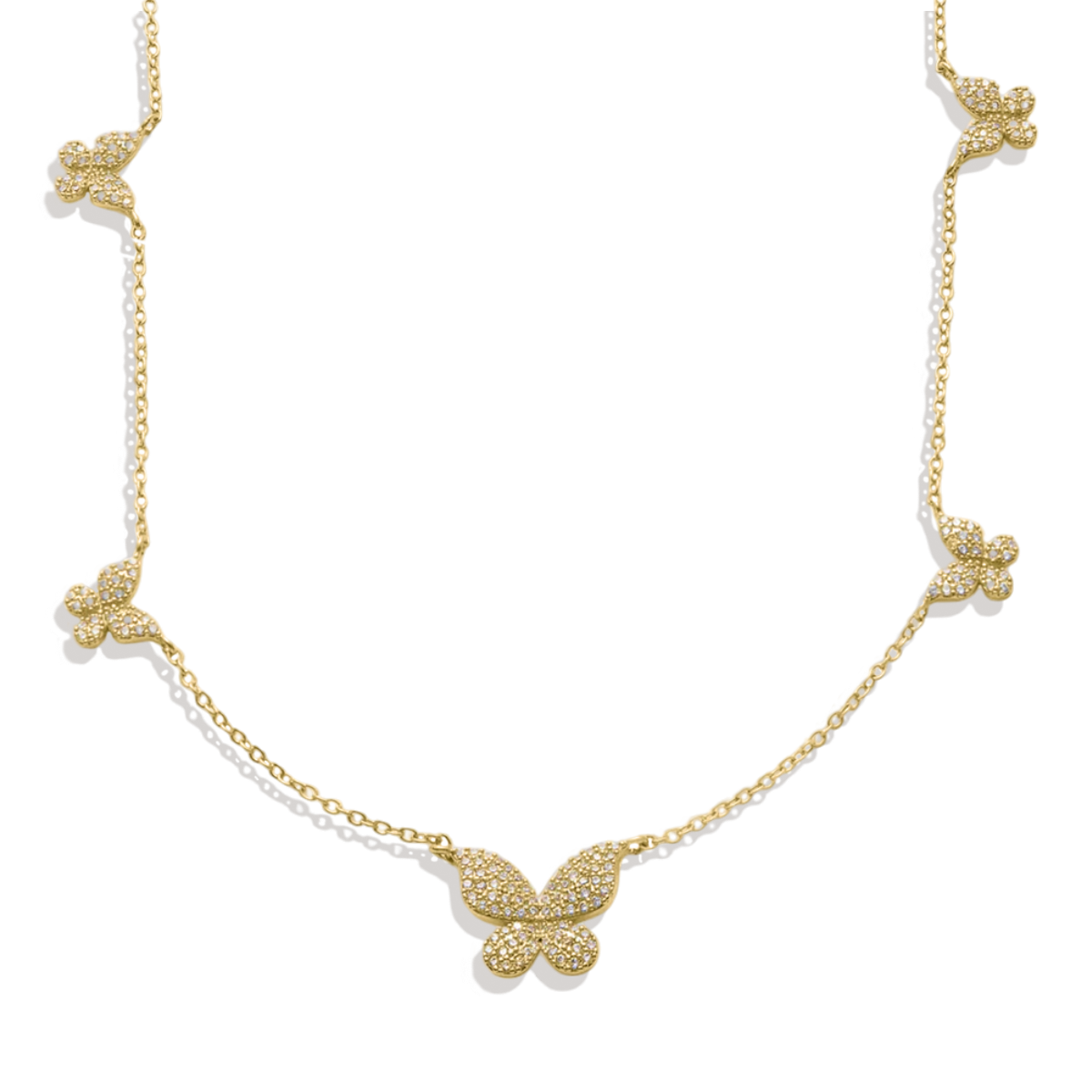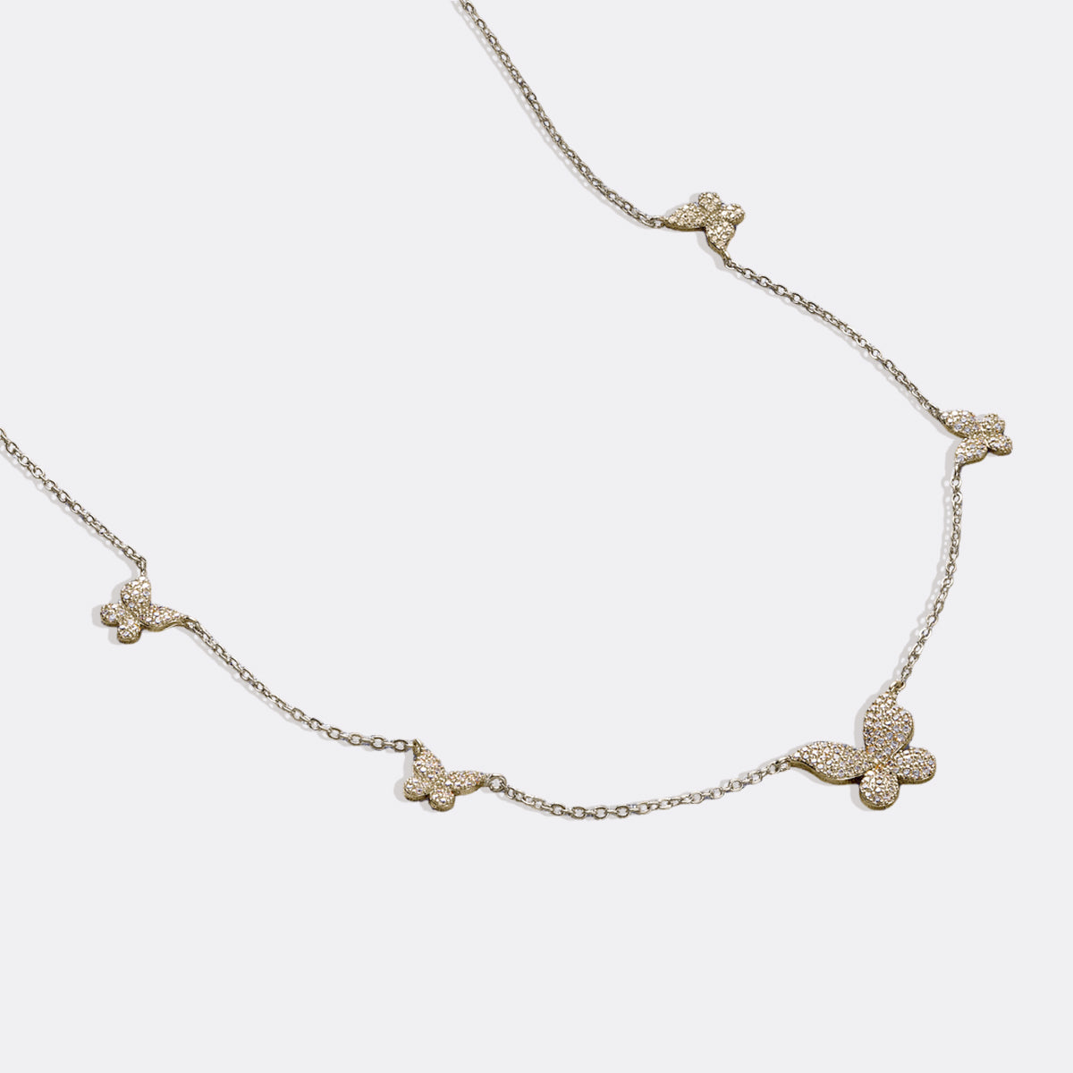 A beautiful and elegant necklace featuring five butterflies. Crafted in sterling silver, with option for yellow gold plate or white gold plate, rose gold plate.