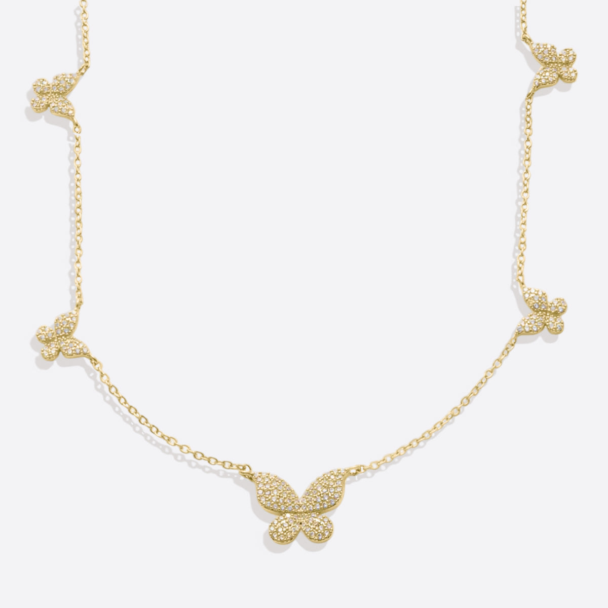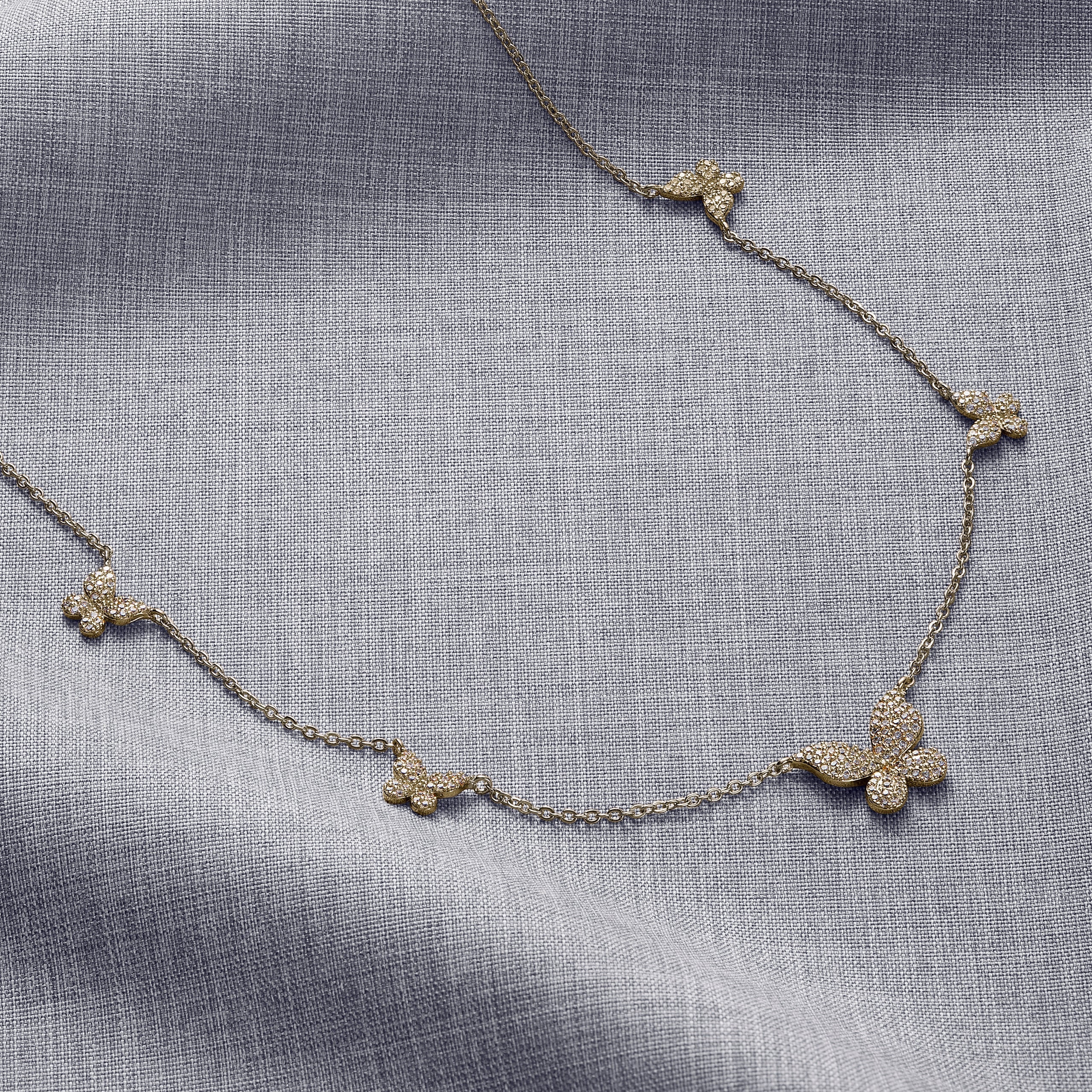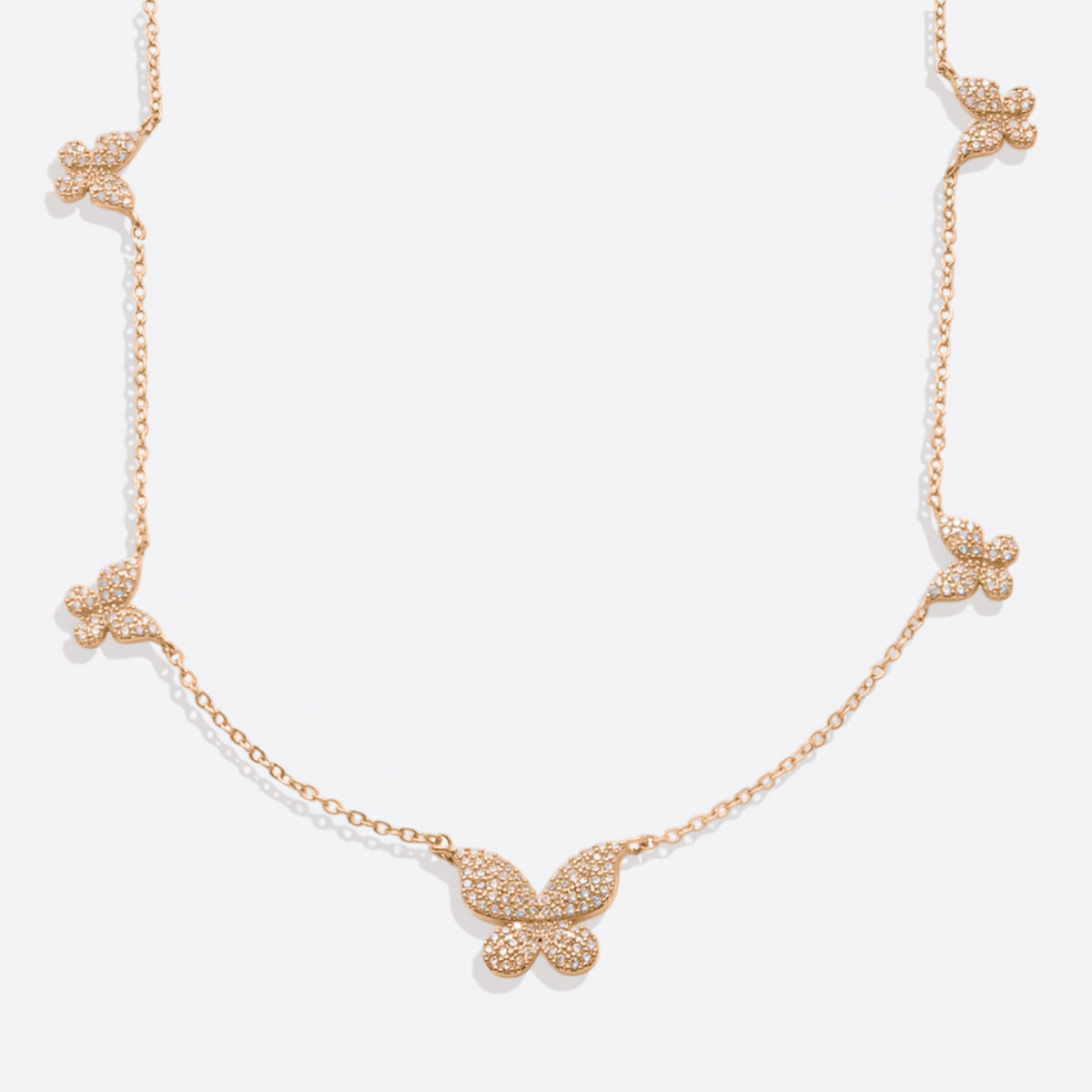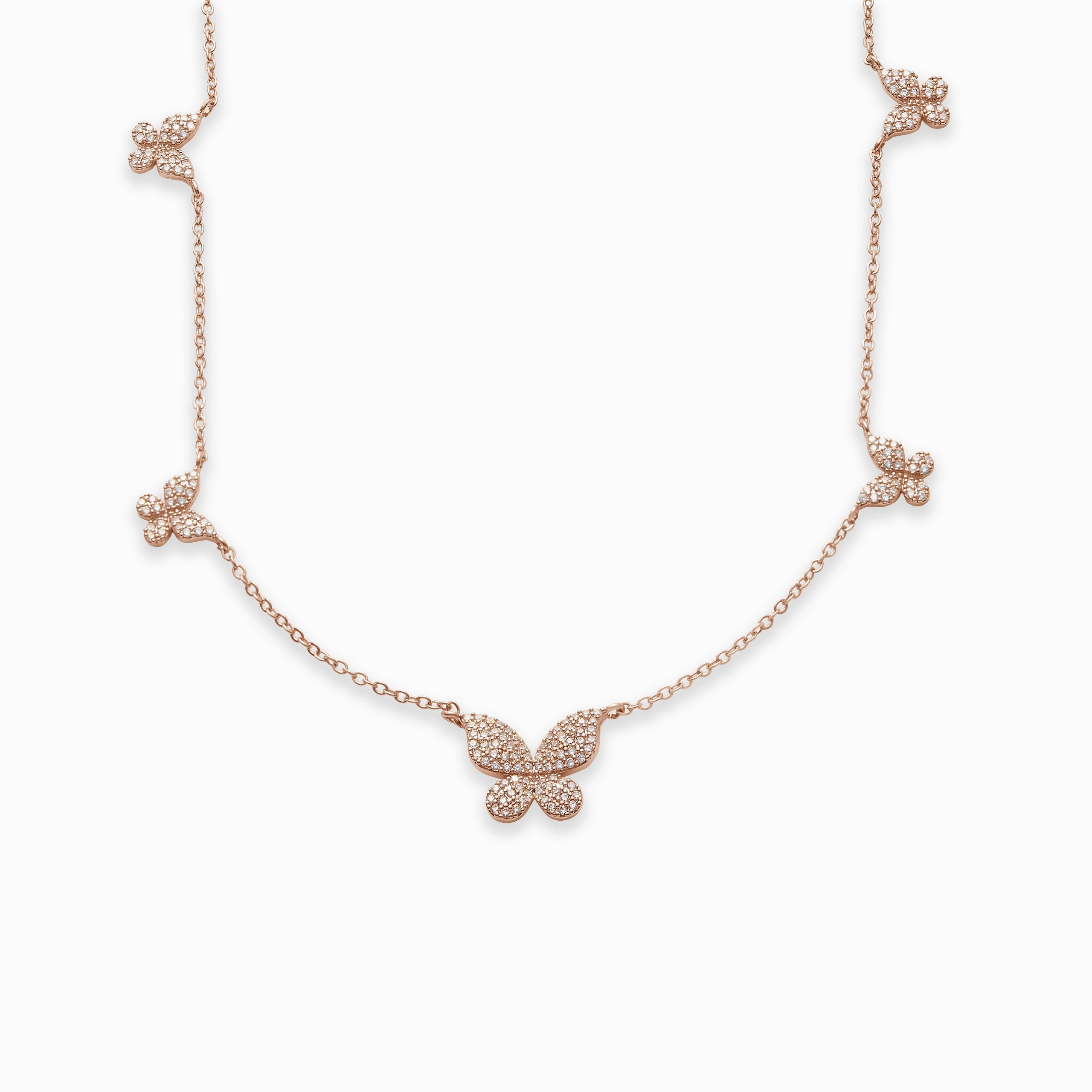 A beautiful and elegant necklace featuring five butterflies. Crafted in sterling silver, with option for yellow gold plate or white gold plate, rose gold plate.