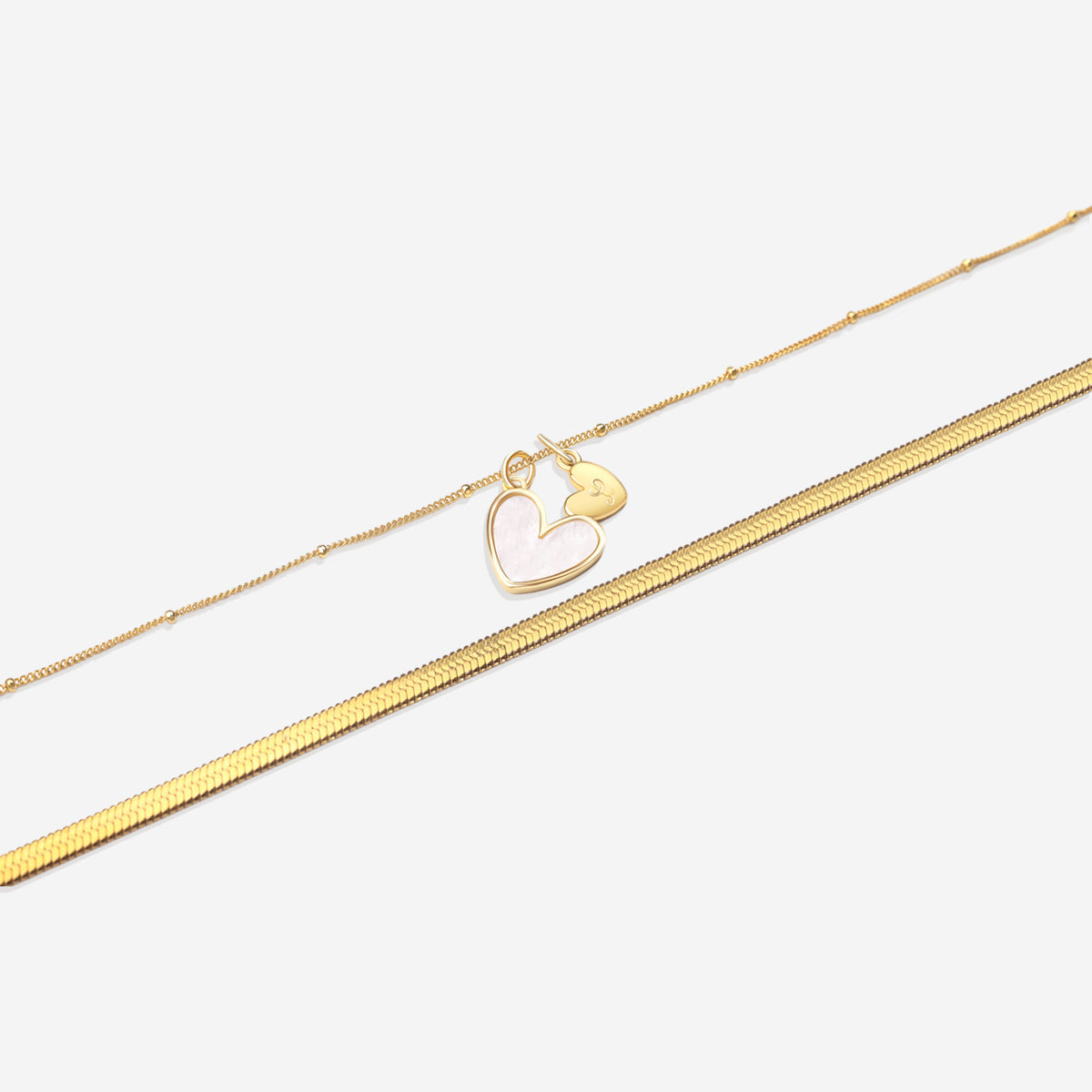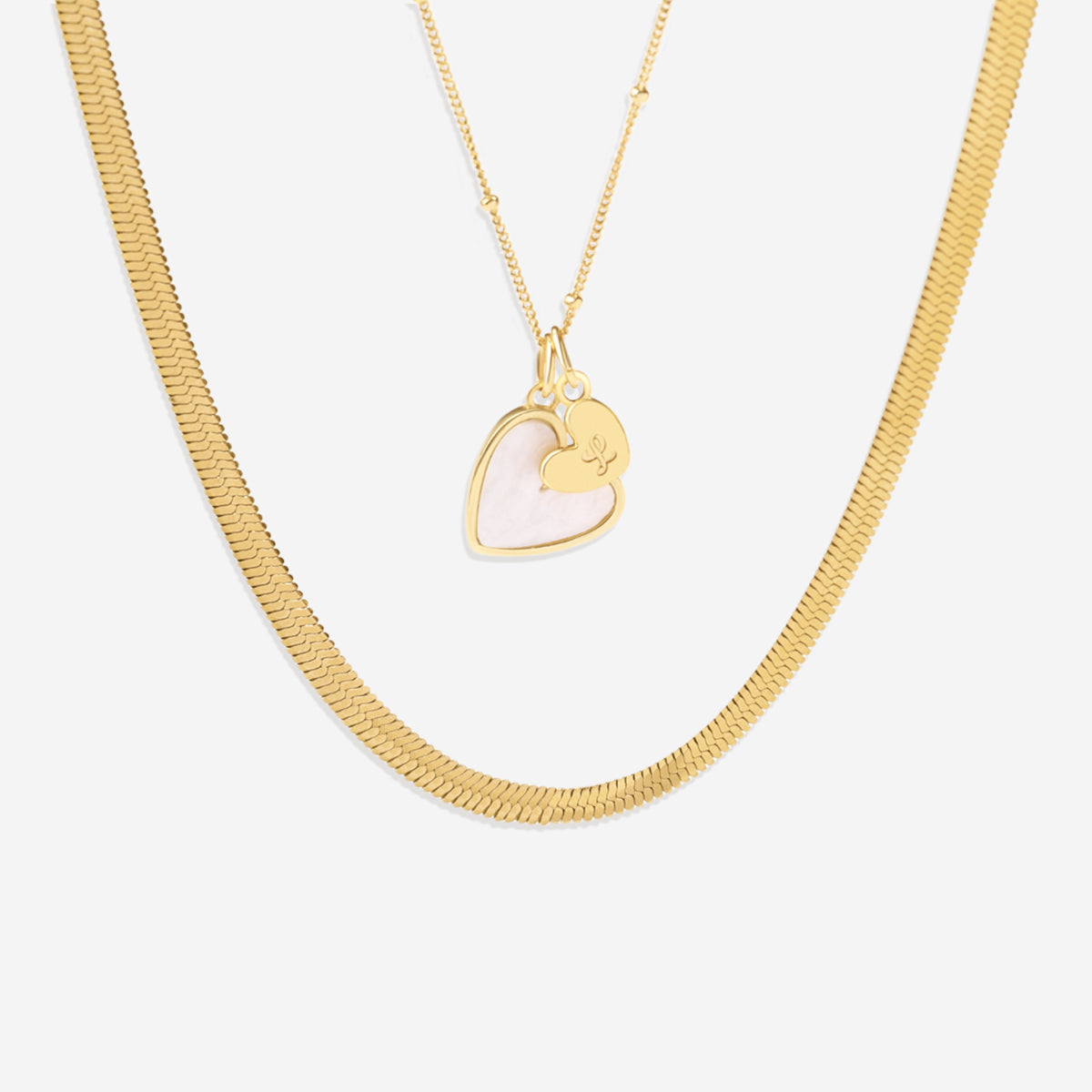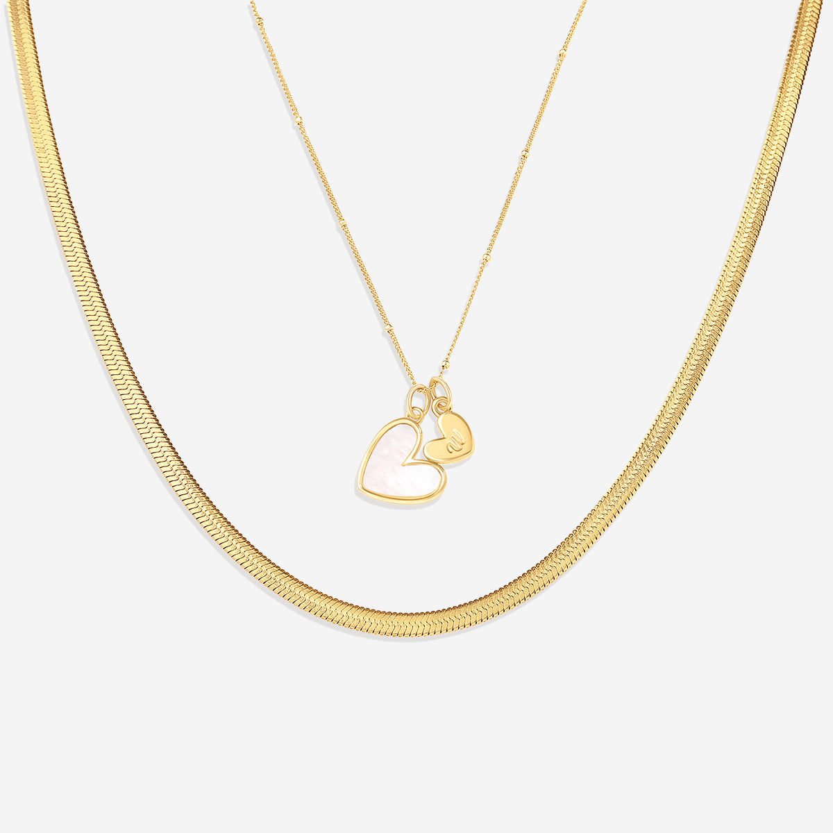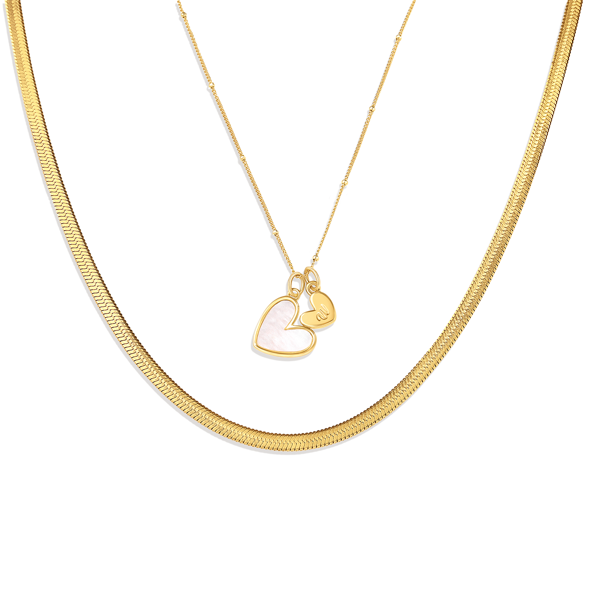 Mother of Pearl Initial Heart & Herringbone Necklace Set combines timeless elegance with personal charm. This set allows you to wear the pieces together for a layered look or individually for a more subtle statement. It is perfect for adding a personalized and stylish flair to any outfit, making it a fantastic gift or a lovely addition to your own jewelry collection.