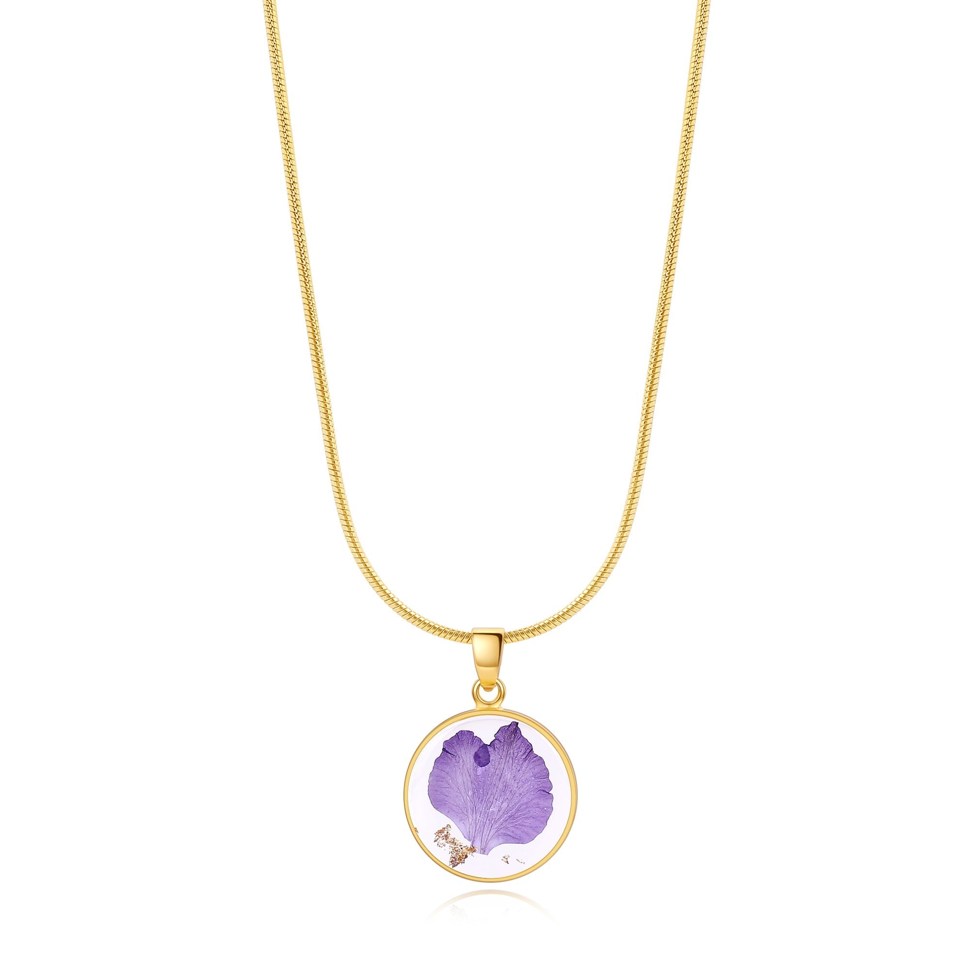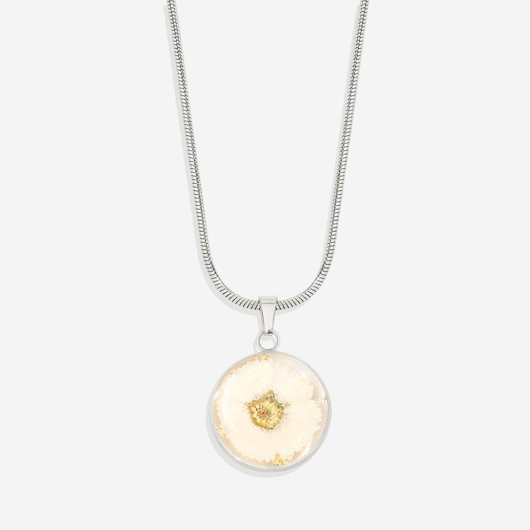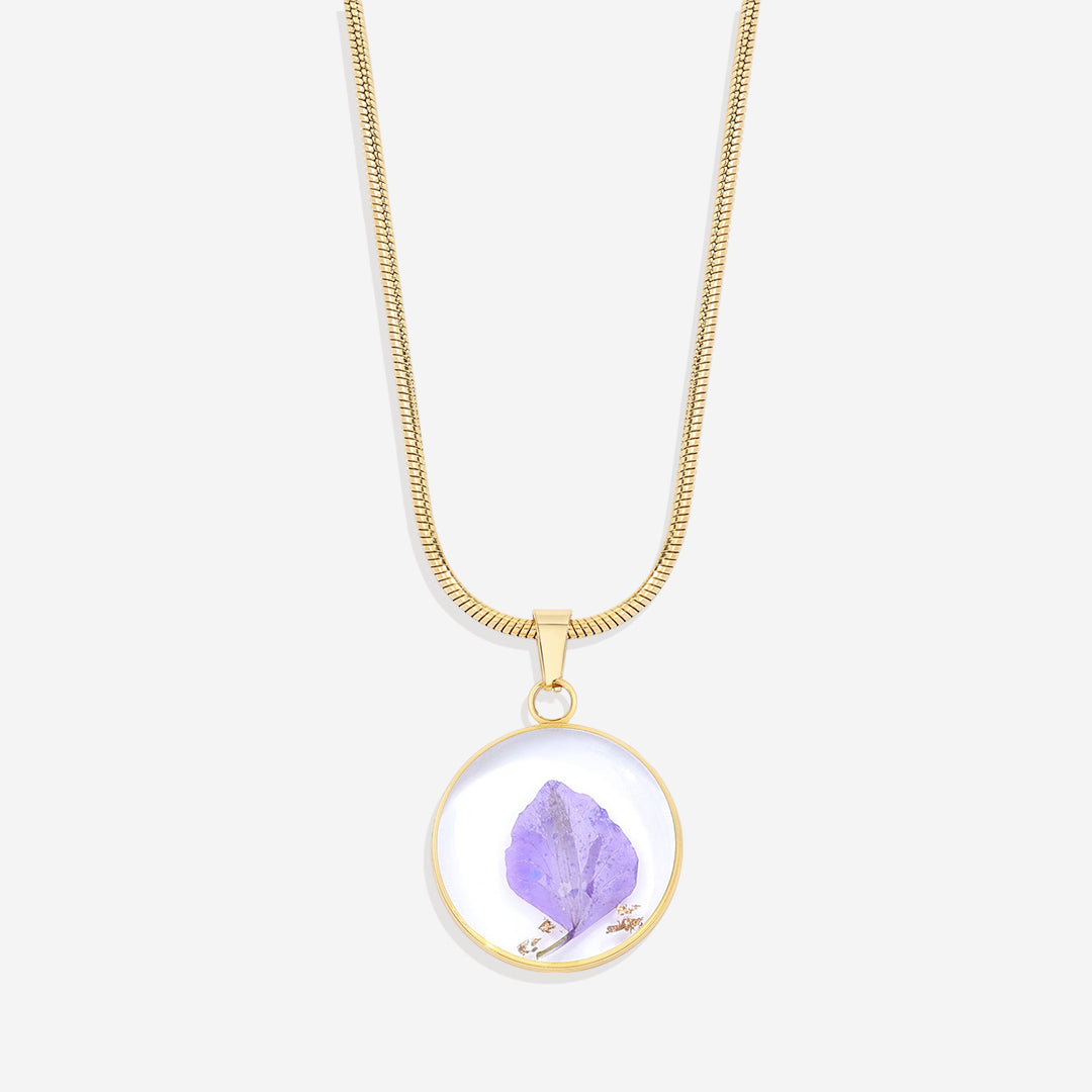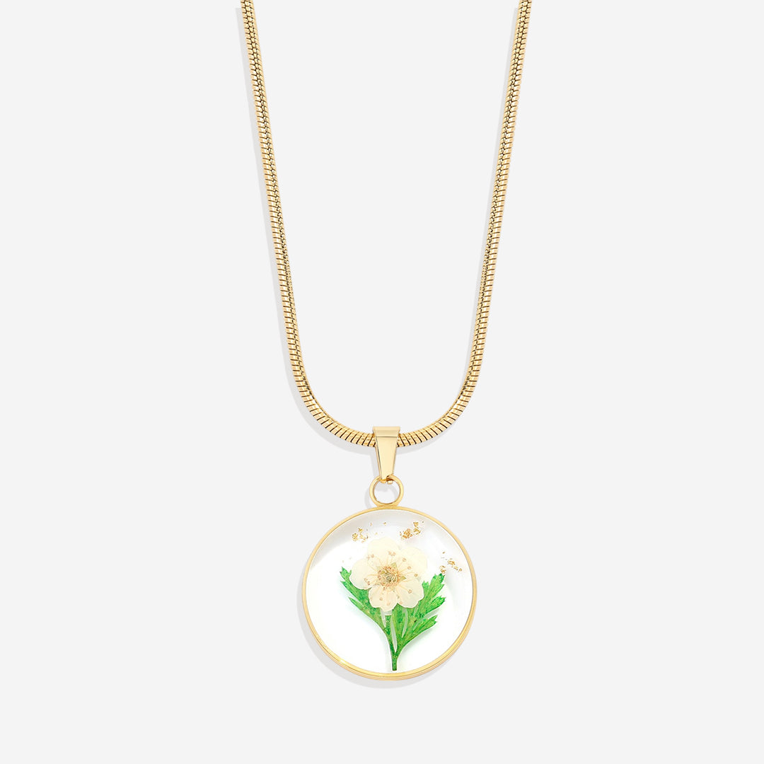 A gorgeous, unique piece to add to your stack, the Pressed Birth Flower Necklace features a resin pendant containing a real flower on a sleek snake chain.