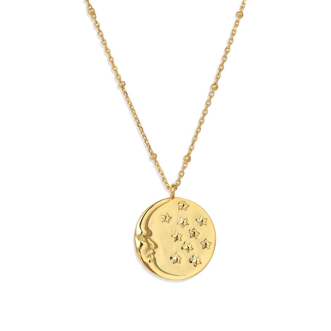 Crafted in sterling silver, with option for yellow gold plate or white gold plate, rose gold plate. This necklace serves as a beautiful reminder of the magic and majesty of the night.