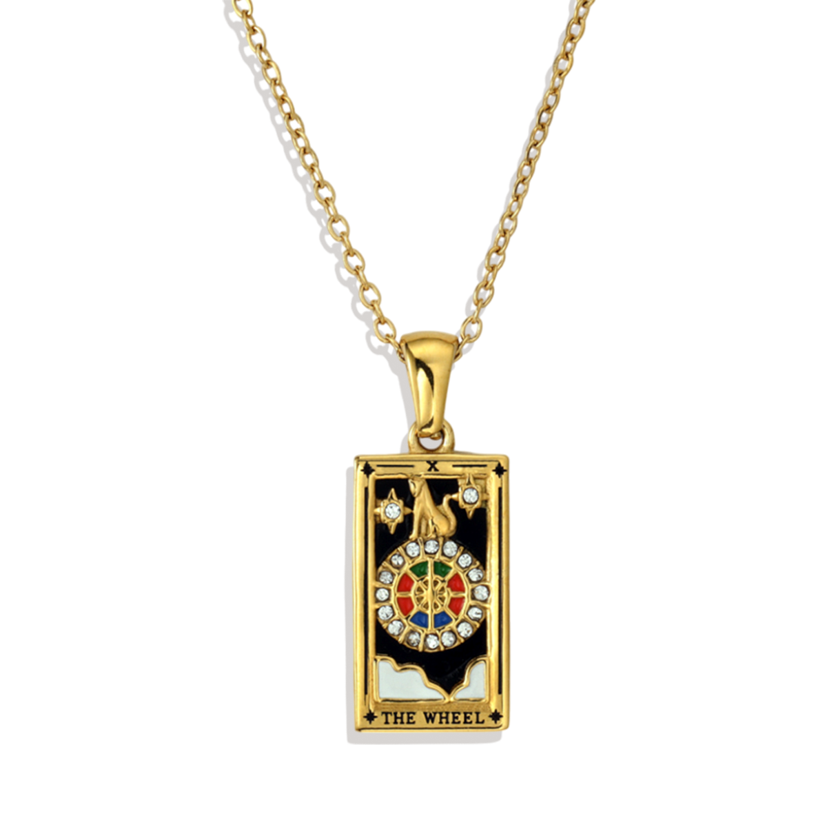 The Wheel Tarot Necklace beautifully captures the dynamic essence of change, cycles, and destiny, which are central to The Wheel of Fortune card in tarot. This intricately designed piece features a pendant depicting the iconic wheel, symbolizing life's constant flux and the opportunities that arise from the ebbs and flows of fortune.