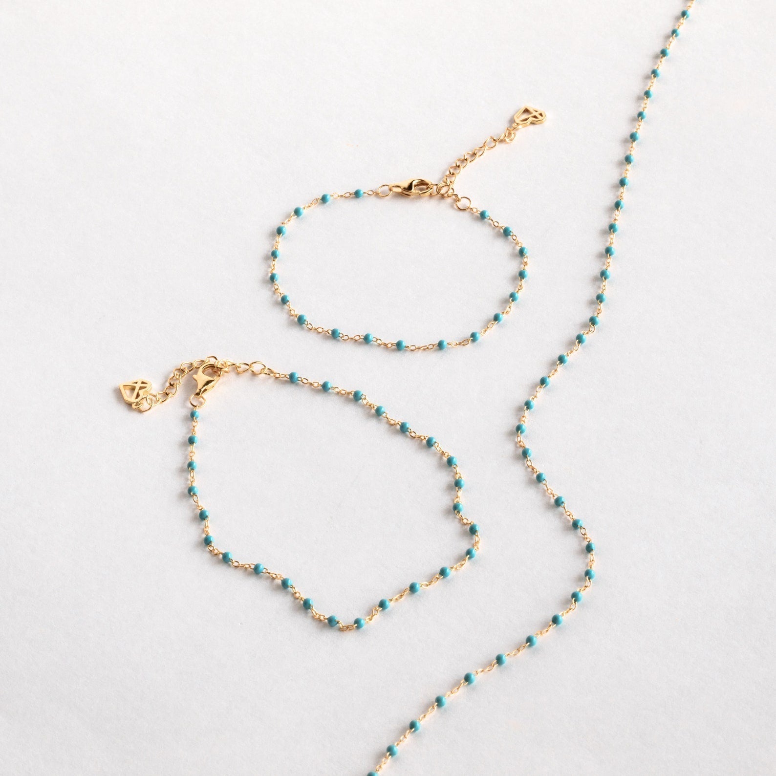 The Turquoise Beaded Bracelet is the perfect blend of effortless beauty and delicate craftsmanship. Featuring radiant turquoise beads spaced elegantly along a fine chain, this piece adds a touch of color and meaning to your jewelry collection.