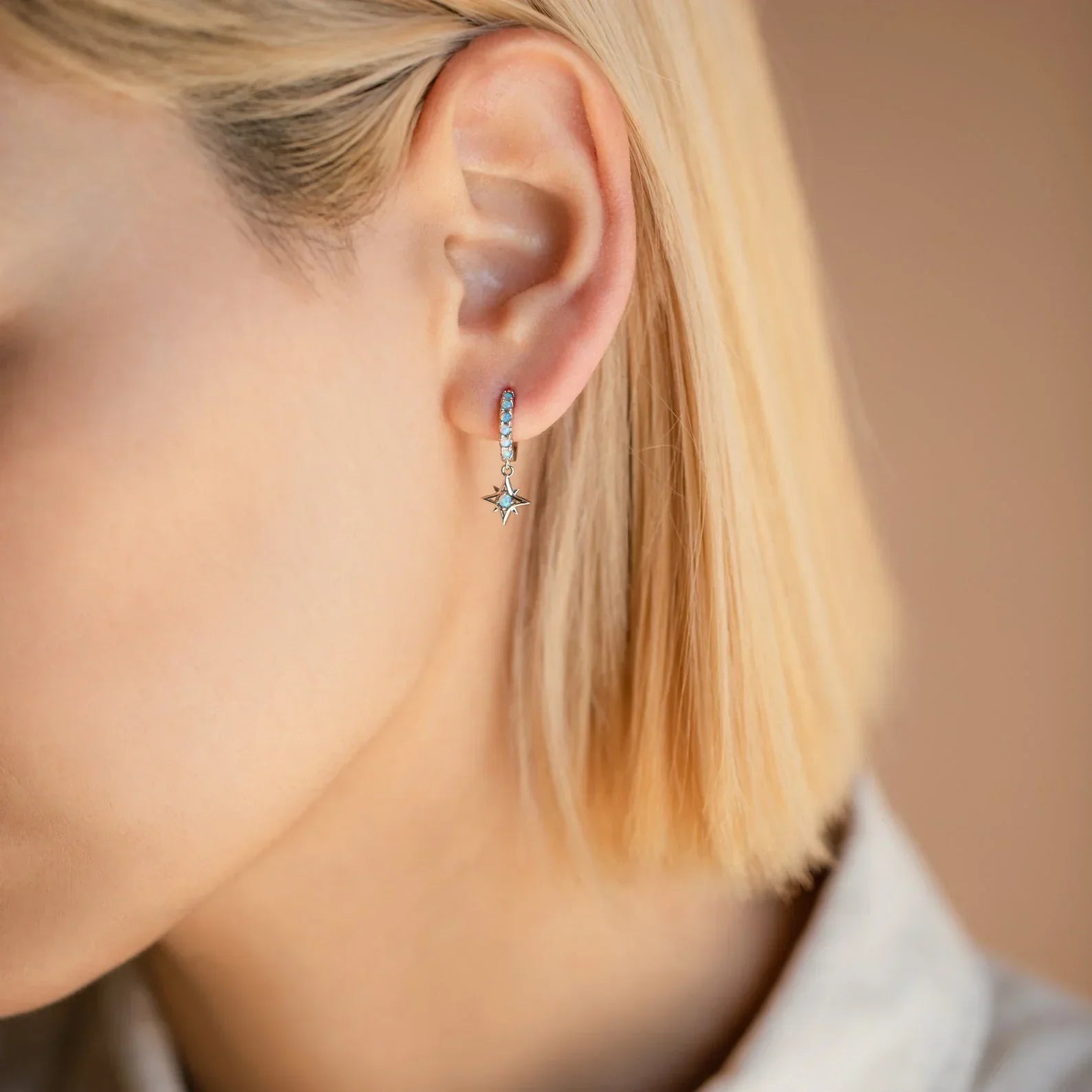 Shine like the star you are with our enchanting Astra Earrings. Designed with iridescent opal-studded huggie hoops, each earring features a delicate charm—one dangling moon and one dangling star—to capture the magic of a starry night sky.