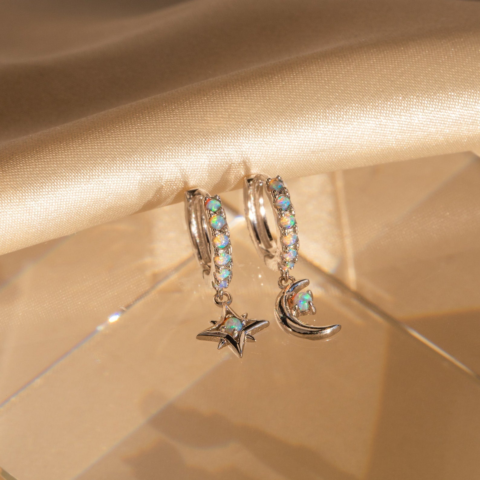 - Features: Opal-studded huggie hoops with one moon and one star charm
