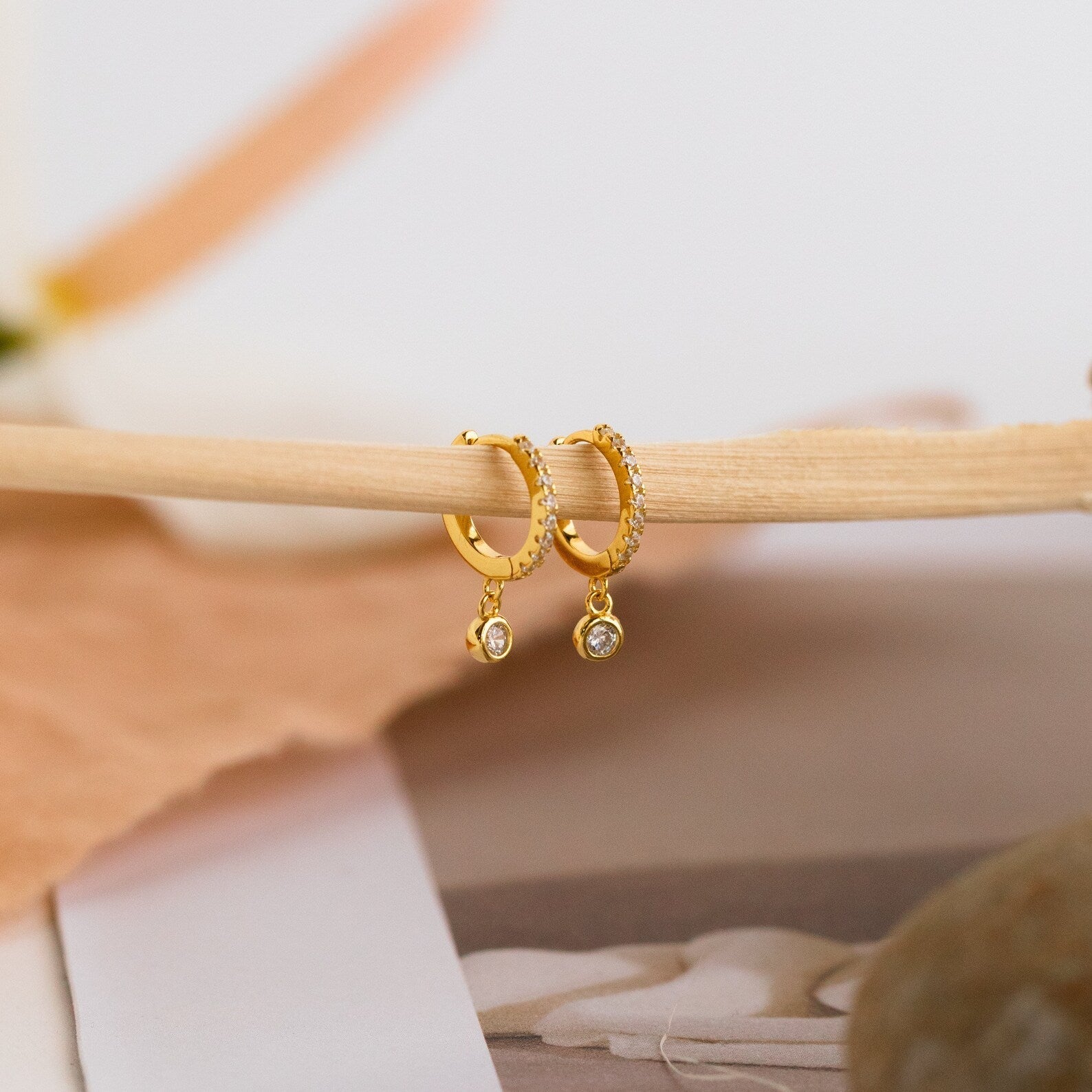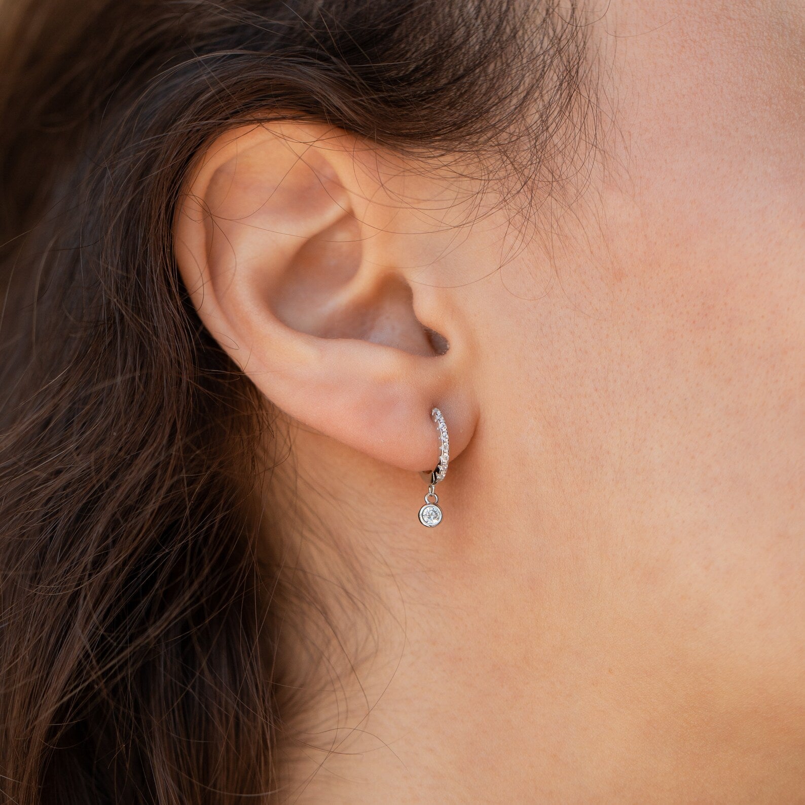 The focal point of these earrings is the dainty pave hoops, featuring a delicate arrangement of sparkling stones that catch the light with every movement. Suspended from the hoops is a charming 3mm CZ Diamond stone, adding an extra touch of brilliance and sophistication to the design. With an inner diameter of 8mm and an outer diameter of 11mm, these earrings strike the perfect balance between subtlety and statement.