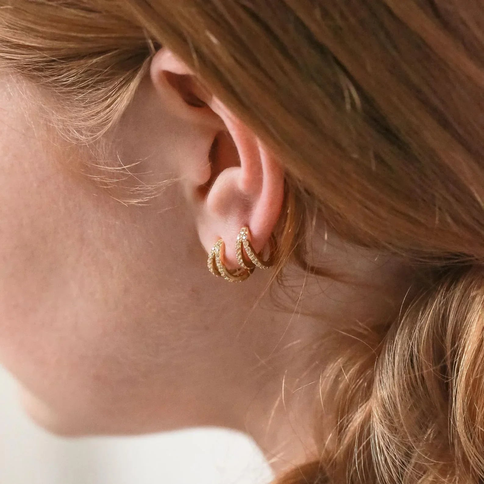 The Esther Duo Pave Huggie Hoops bring a cool, multi-textured approach to your lobes. With pave detailing that glimmers and gleams throughout the day, these huggie hoops also feature a double hoop design that adds depth and dimension to your look.