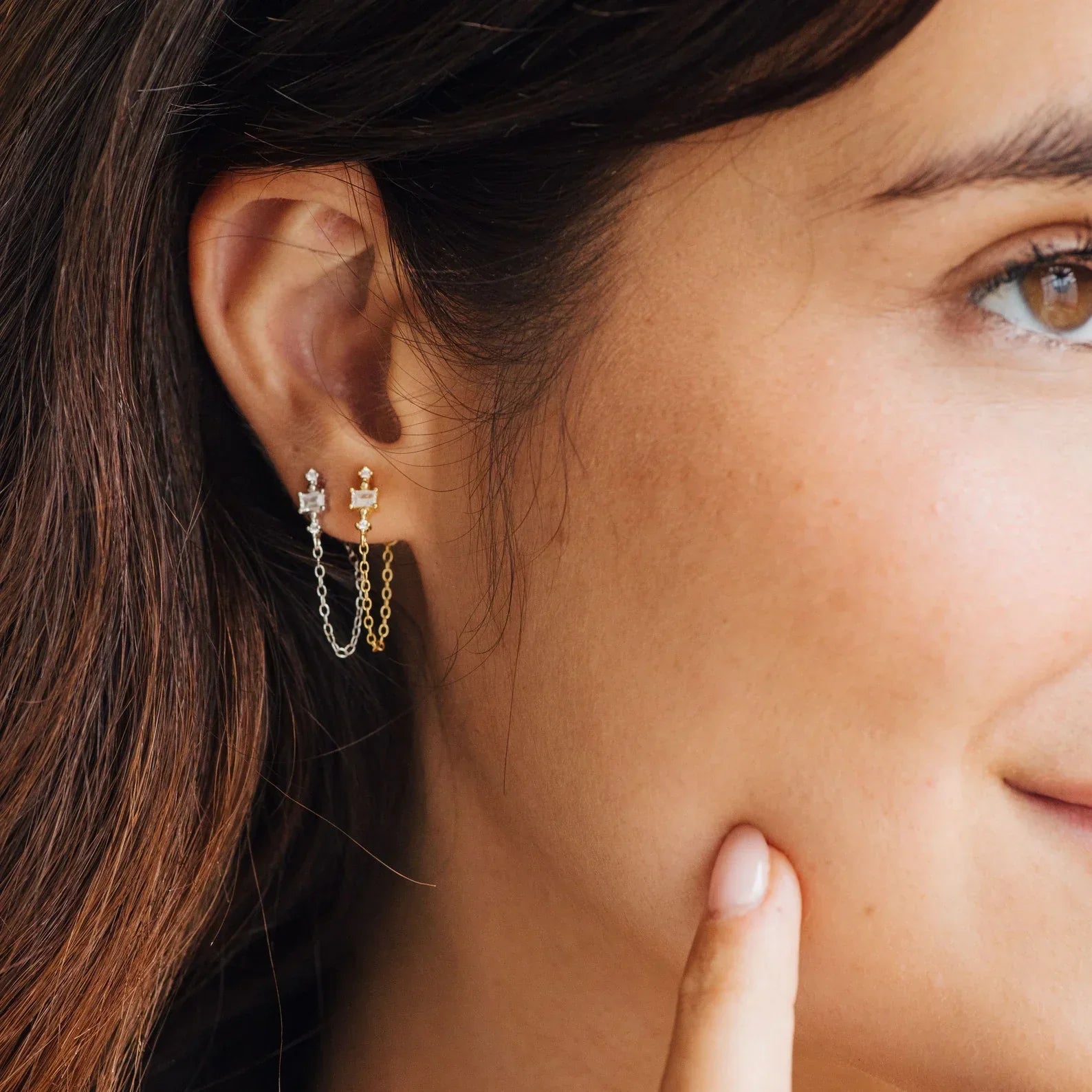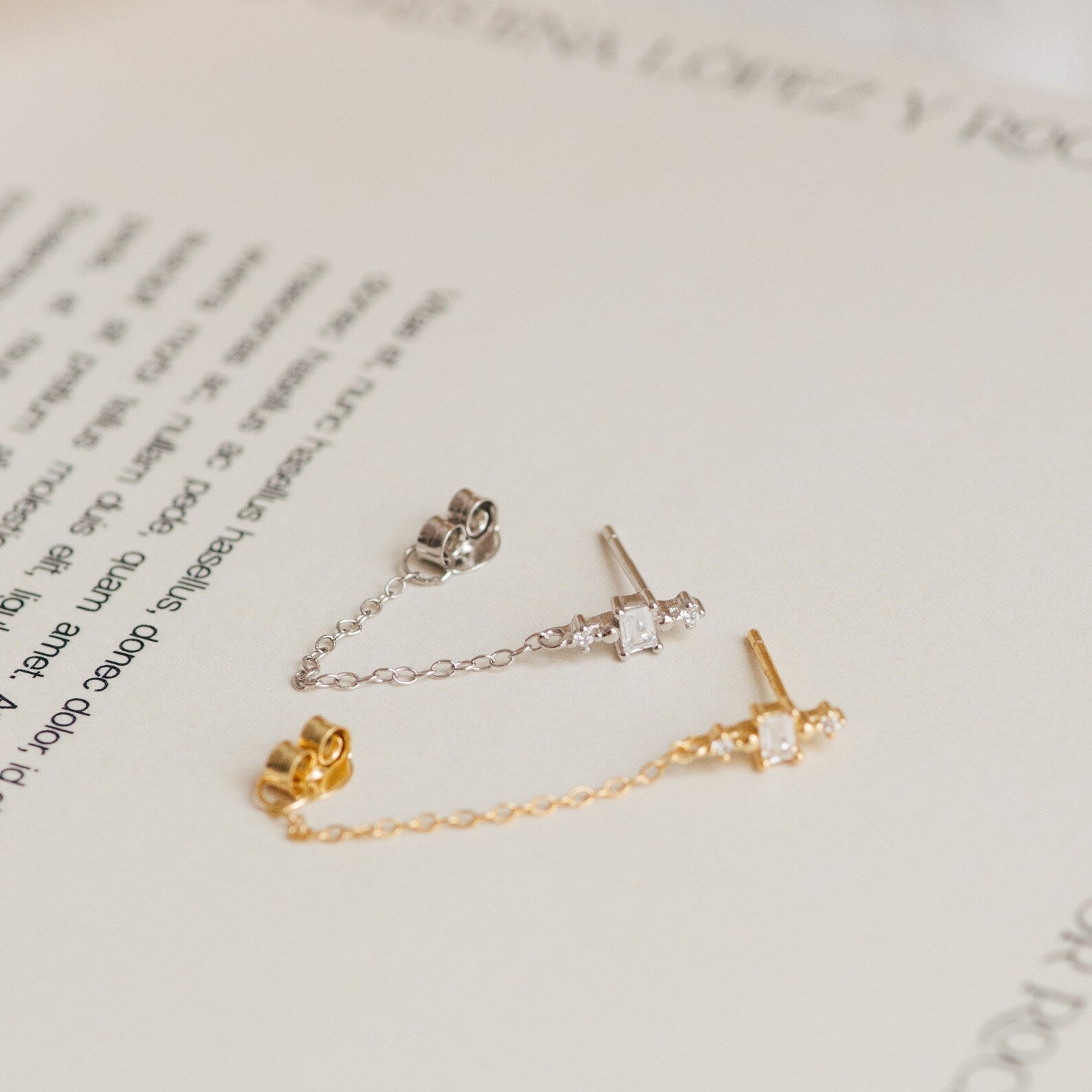These earrings combine grace and versatility. The lightweight chain adds a touch of movement, while the various-sized CZ stones catch the light beautifully. Ideal for both minimalist and bold style lovers alike, they’re your go-to for refined sparkle.