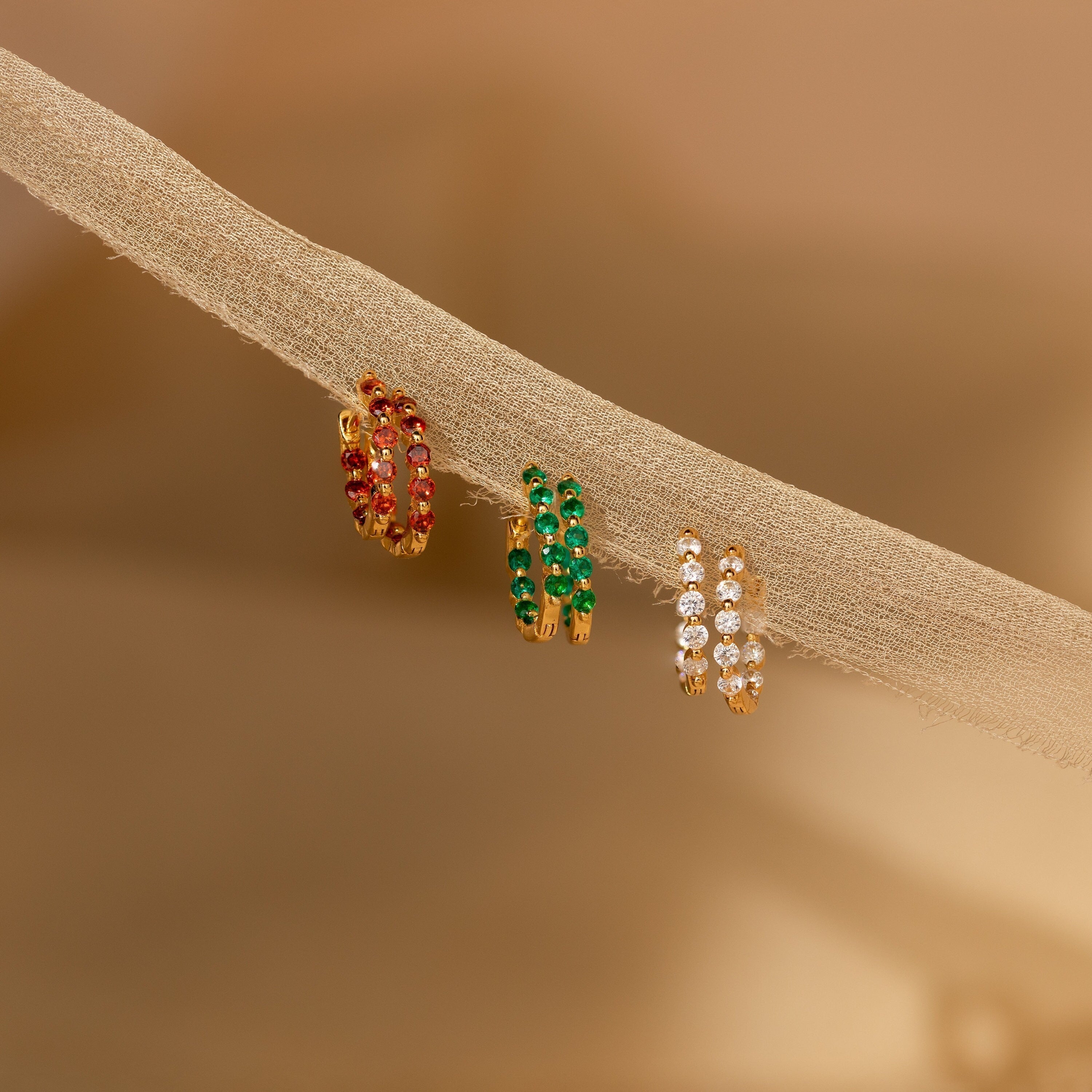 Looking for the perfect birthday gift for a loved one? These gemstone earrings feature a unique and innovative design, where the stones beautifully circle both the inside and outside of the hoop, creating a captivating look.