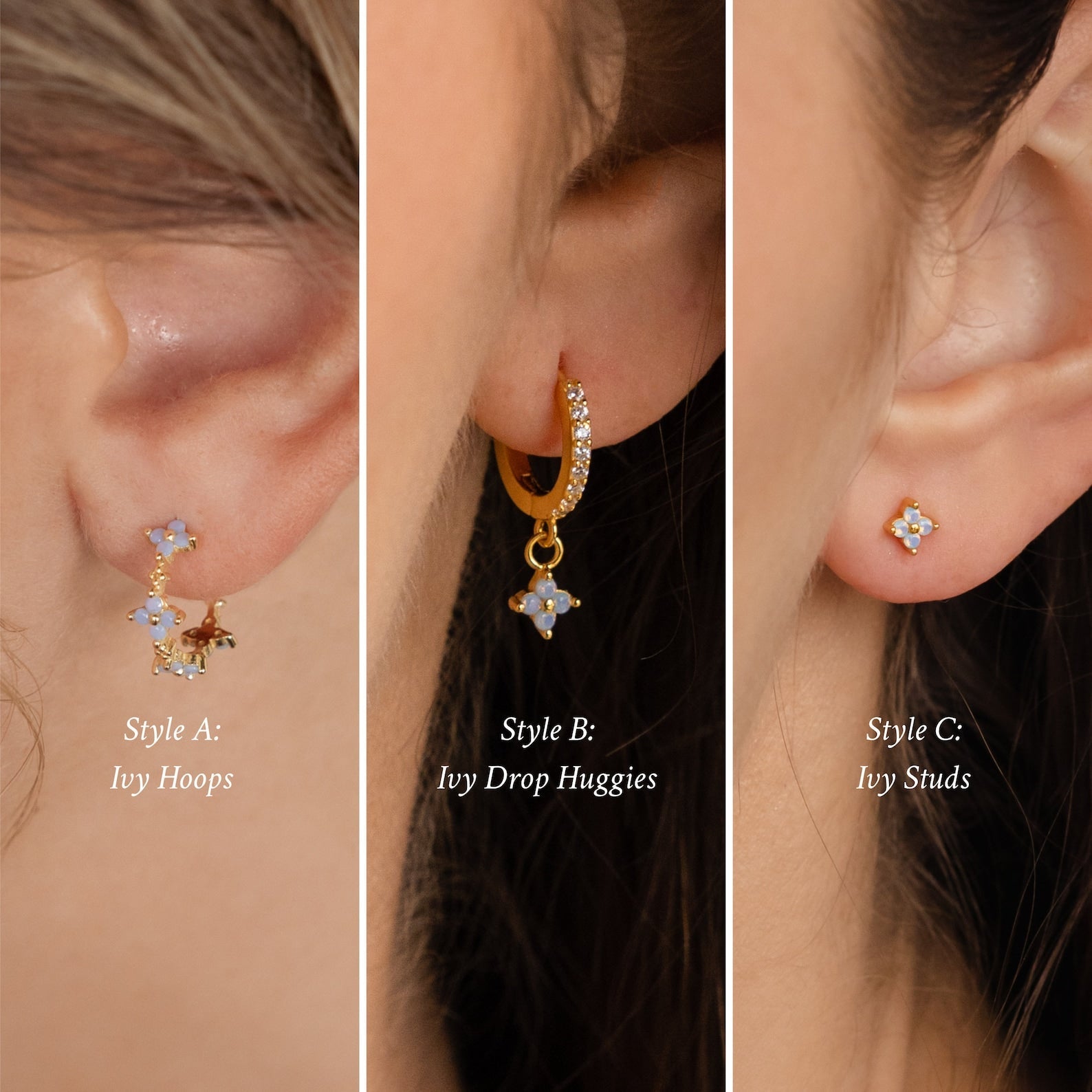 • Ivy Flower Studs: Featuring a ~5mm genuine CZ blue floral stone, these studs are the epitome of simplicity and elegance for those who love a minimalist yet sparkling look.