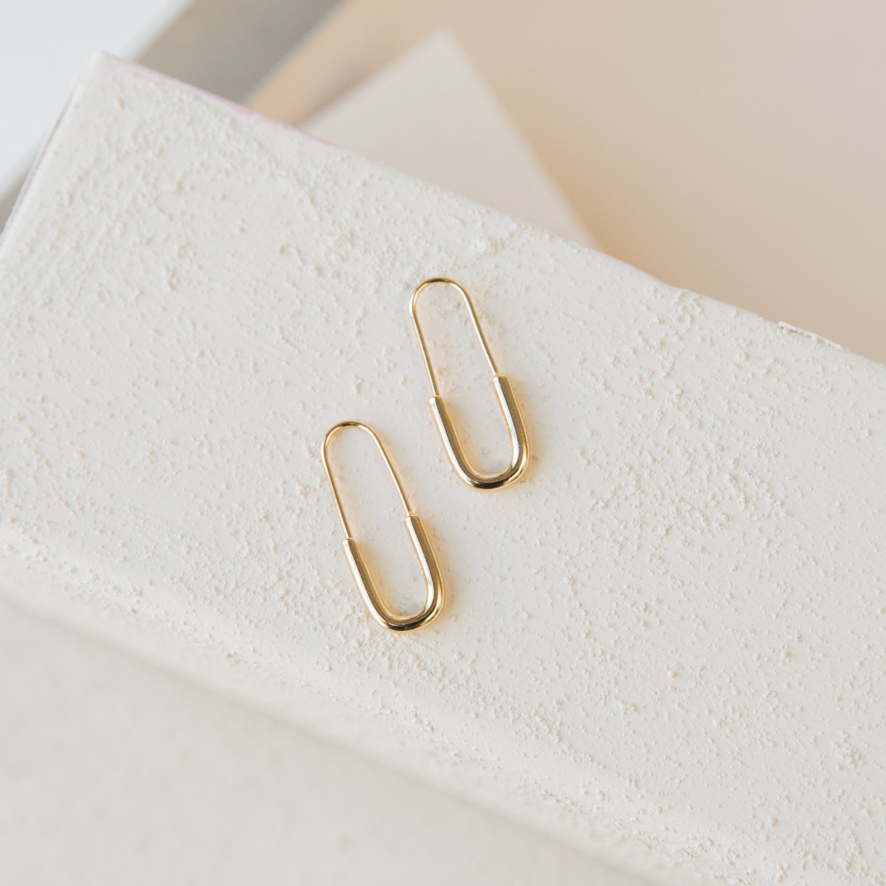 Reimagine the iconic punk trend with these sleek, minimalist safety pin earrings. From afar, they appear as elegant hoops, but up close, their clever silhouette reveals the edgy safety pin form that sets them apart.