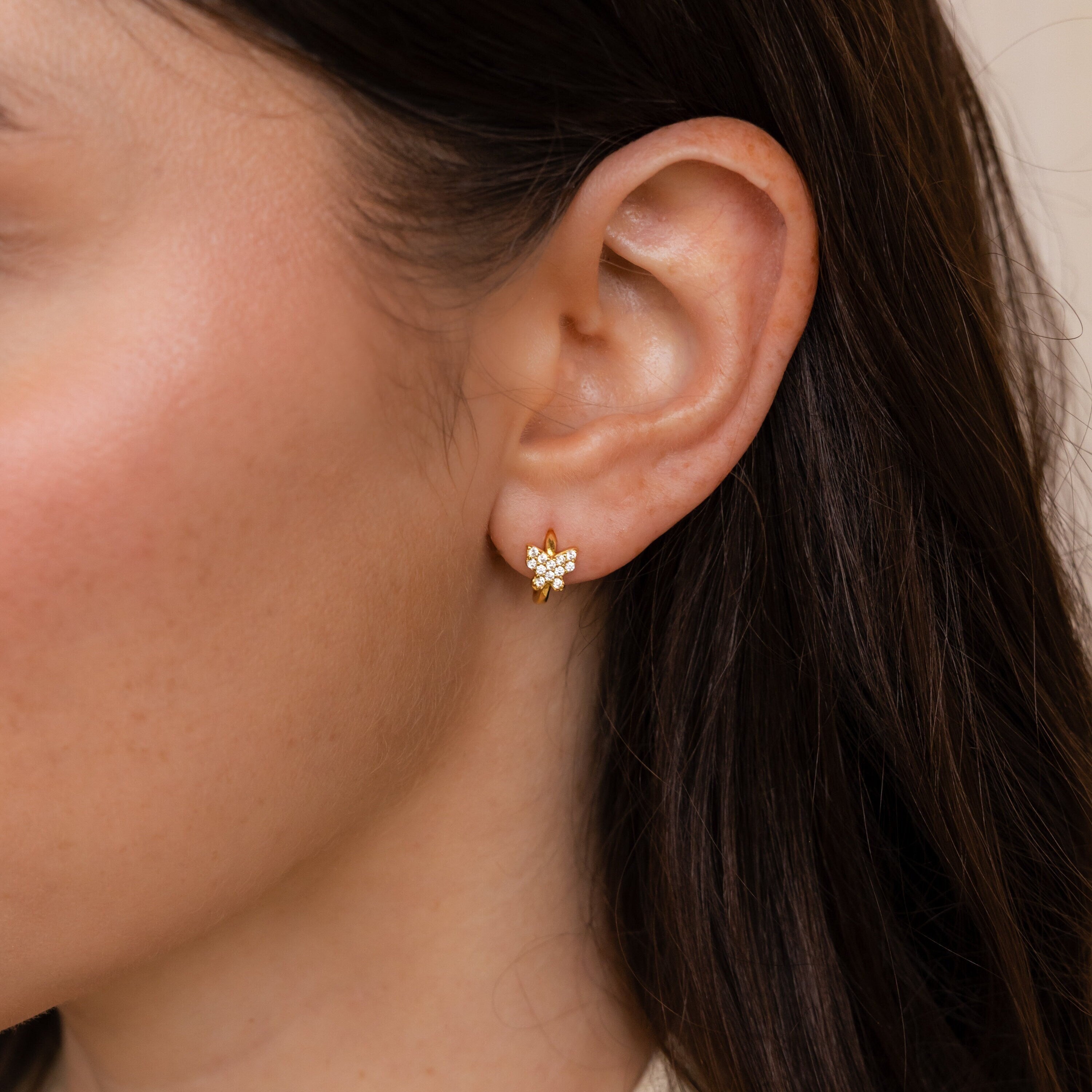 Enhance your everyday elegance with the Pave Butterfly Mini Huggies. Shop now and embrace effortless sophistication!