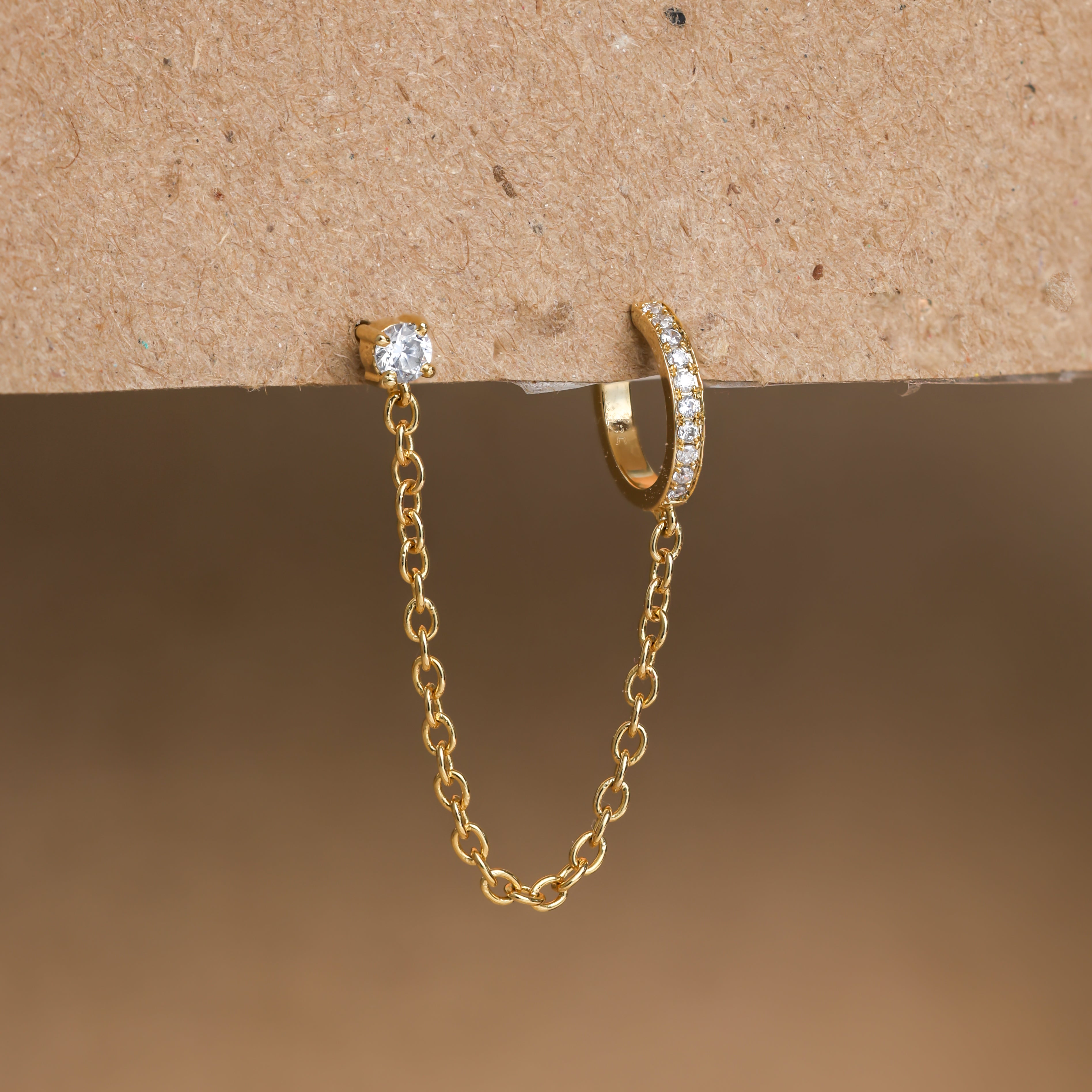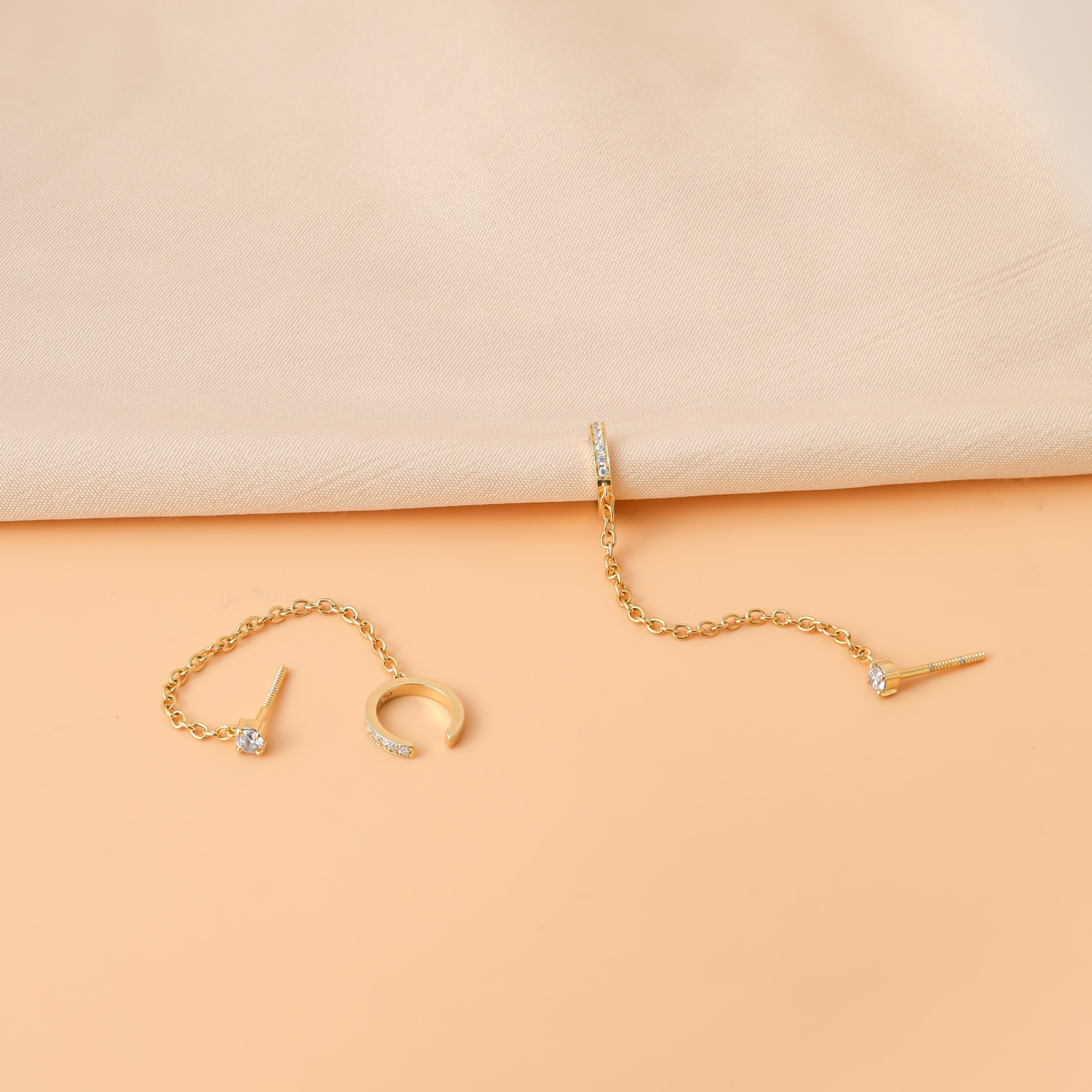 The dainty chain adorned with a sparkling CZ diamond drapes beautifully between a sleek stud and an adjustable ear cuff, creating a modern statement. No piercing required for the cuff — just style, stack, and slay!