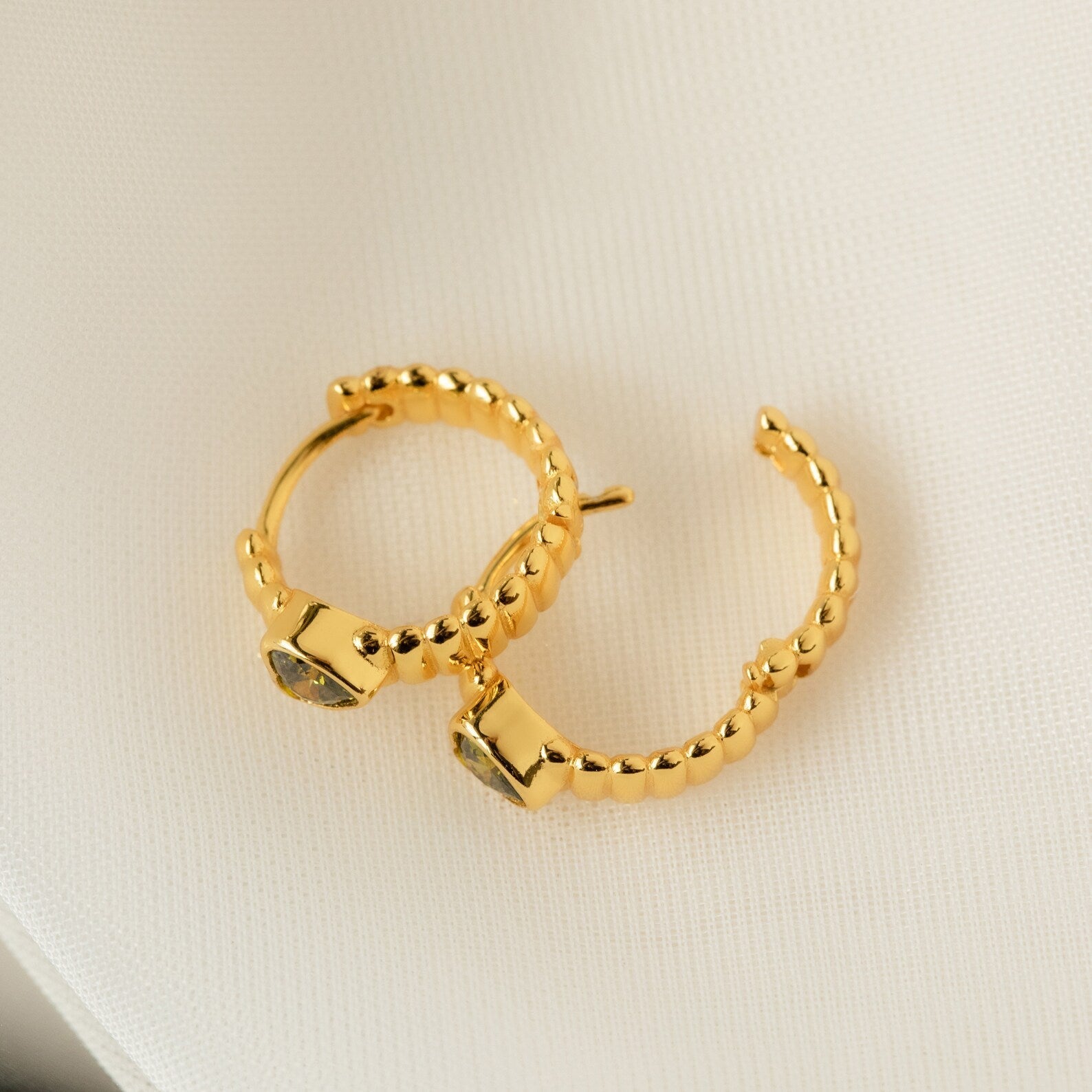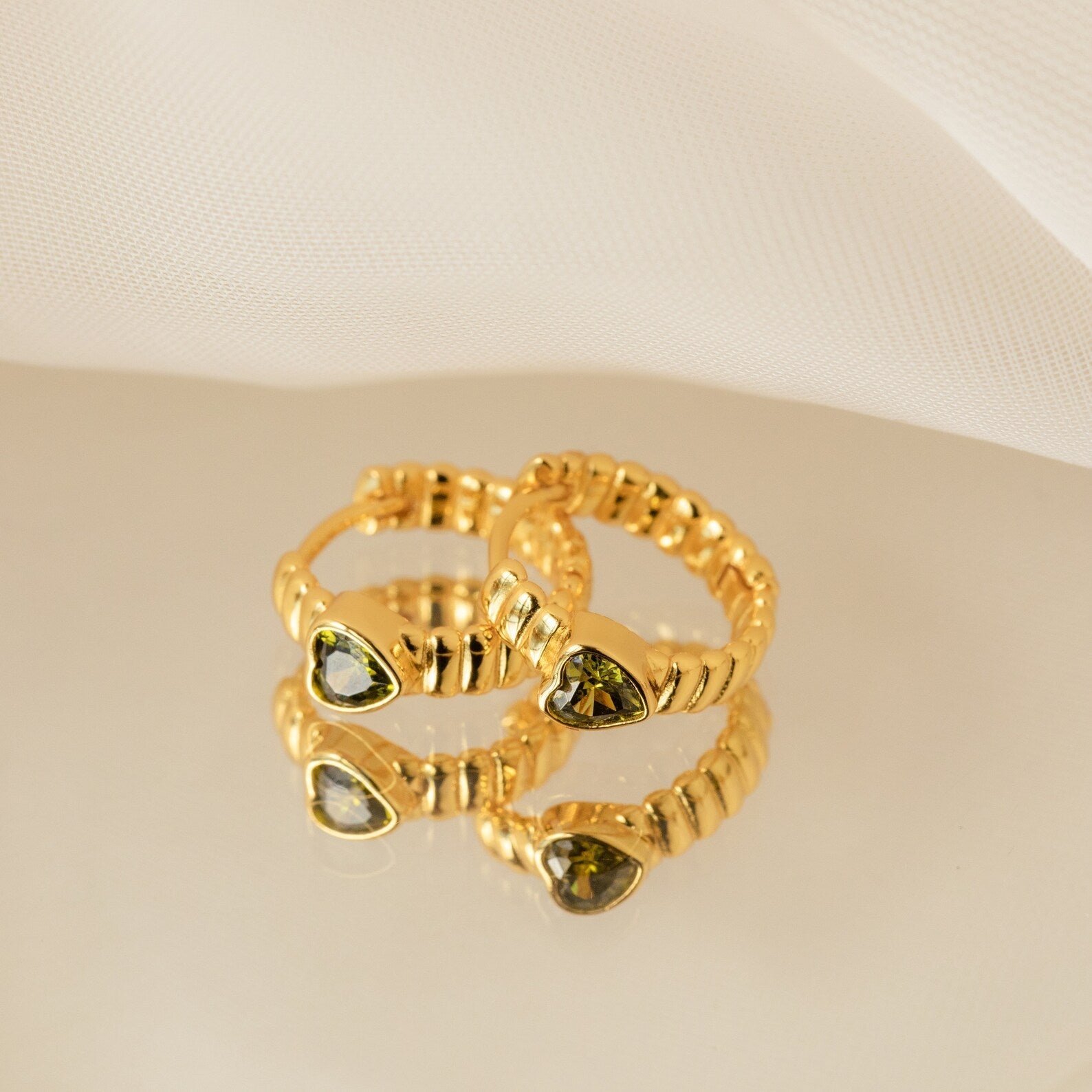 • Design: Textured huggie hoops with 5mm heart-shaped CZ peridot gemstone