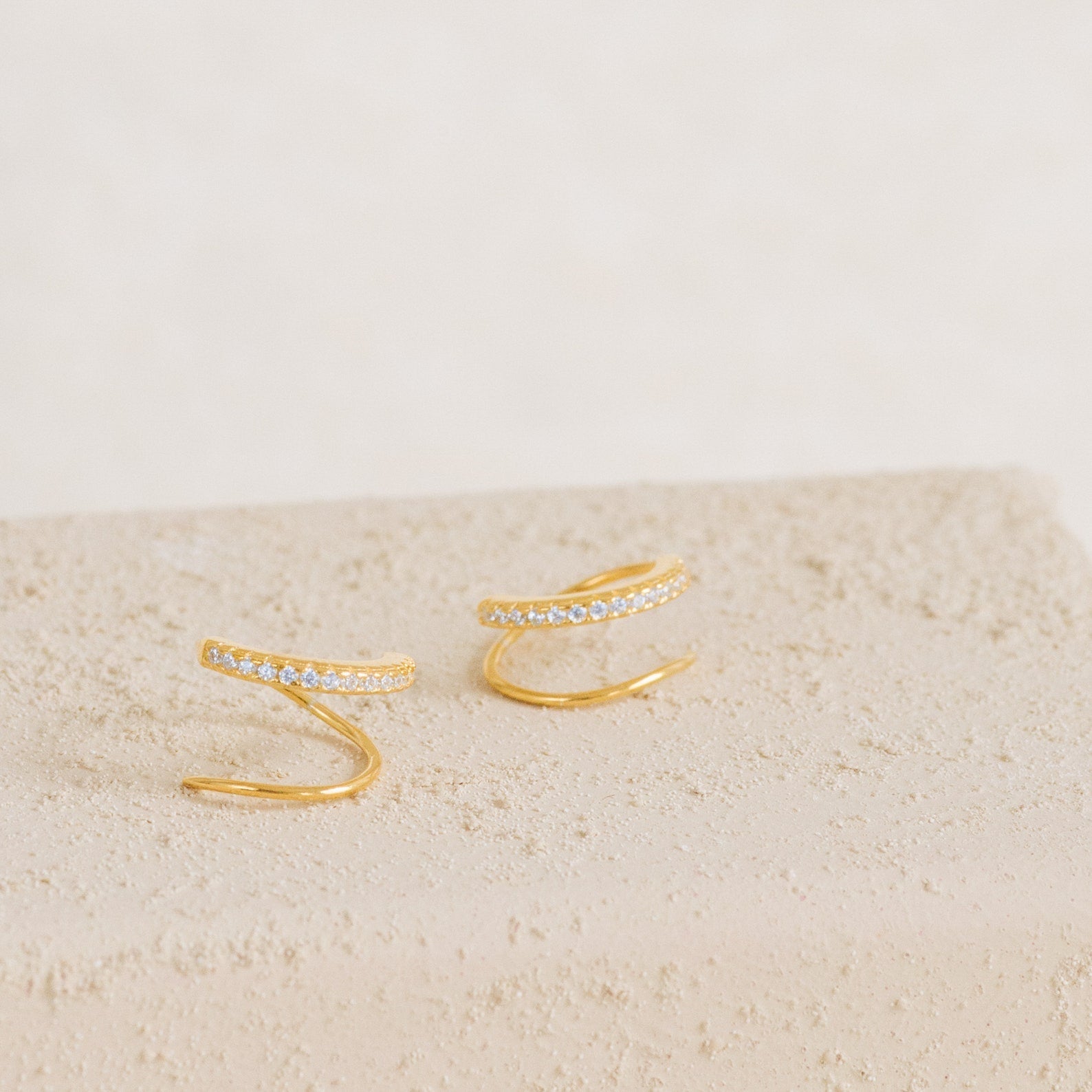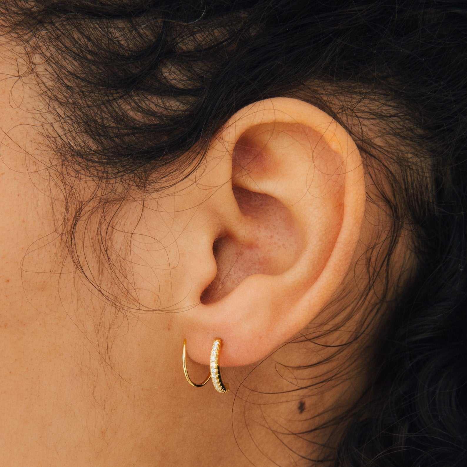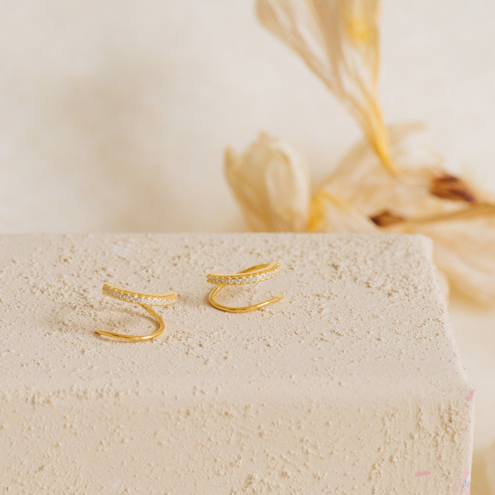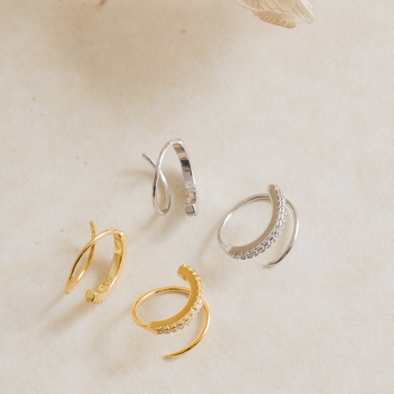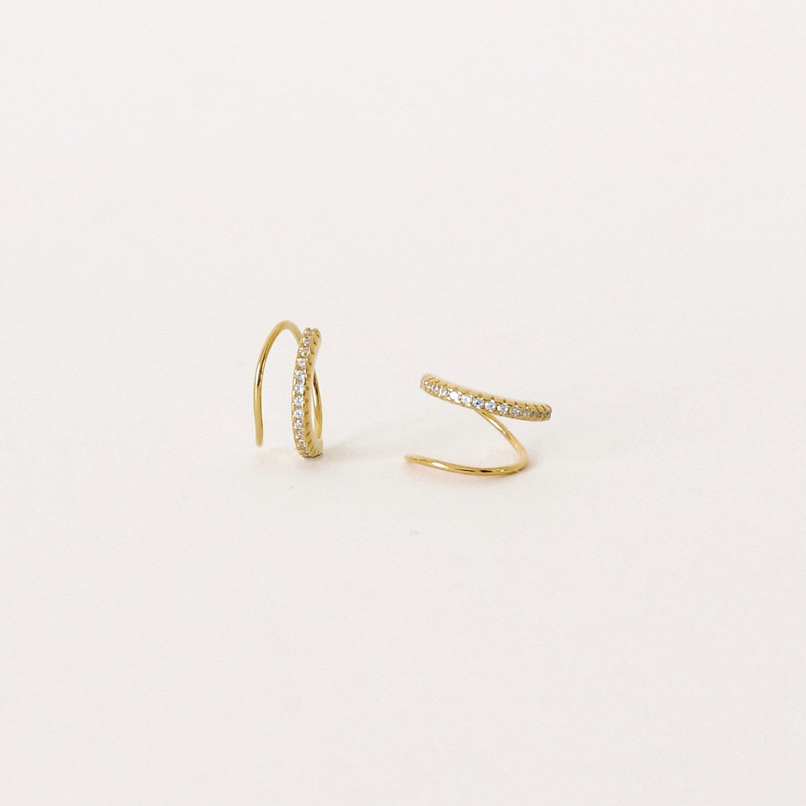 Elevate your look with the River Pave Wire Huggies—a stunning accessory that blends sophistication with innovation. These delicate earrings feature a unique spiral design, creating a striking two-in-one illusion that enhances your double earring game. Small in size but big on impact, these huggies bring understated glamour to any ensemble.