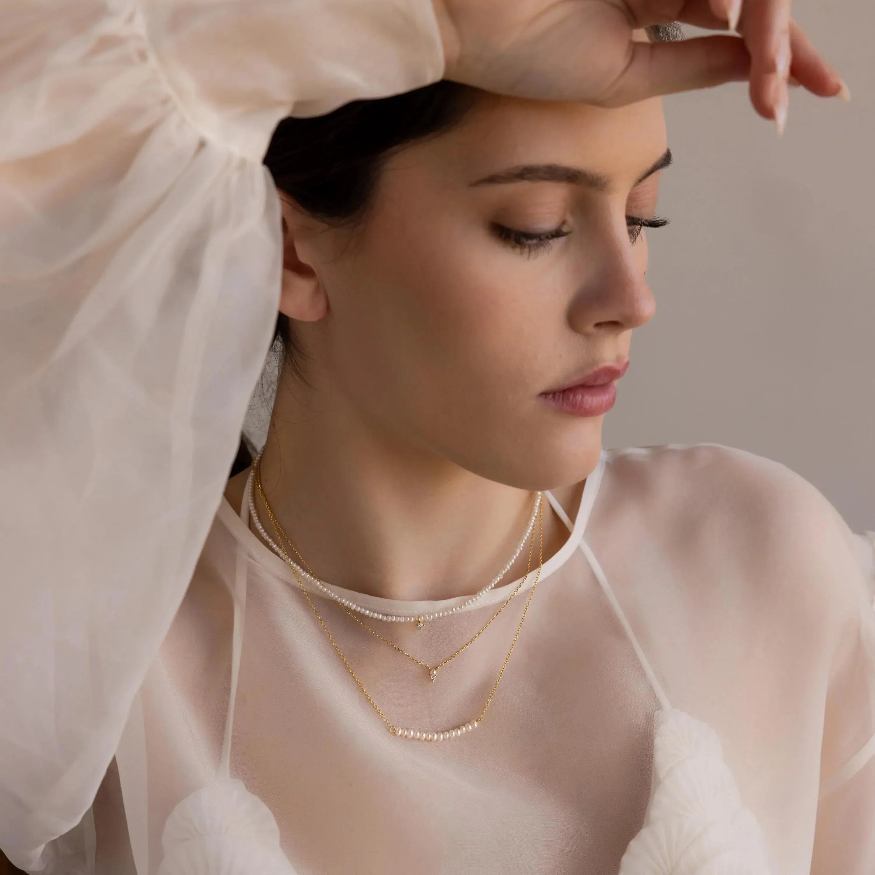 Layer it with a shorter choker or a longer pendant for a modern stacked look. Beautiful on its own as a dainty statement or worn with matching pearl earrings for a cohesive wedding ensemble.