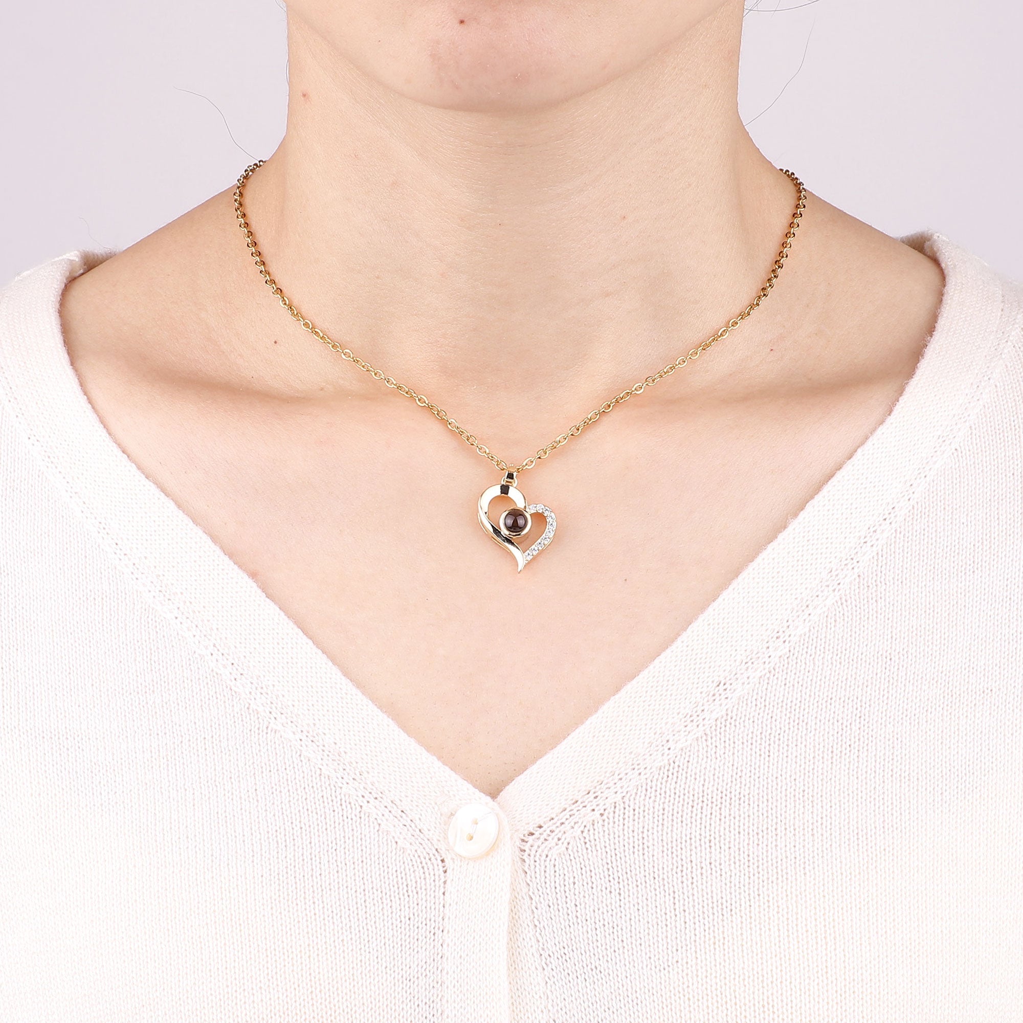 The centerpiece of the necklace is the innovative photo projection stone, discreetly nestled within the heart. This unique feature allows you to carry a special photograph close to your heart. By simply looking inside the stone or holding it up to your phone camera, the hidden image inside is revealed, offering a private and intimate way to keep a memory or loved one near.