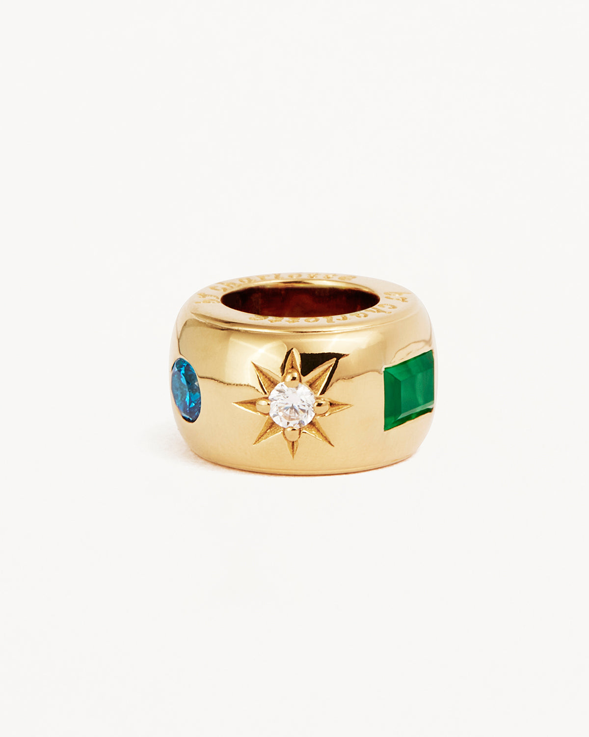 Featuring a high polish finish, it is set with cubic zirconias, green onyx, and synthetic ruby, combining a mix of natural and synthetic stones for a stunning effect.