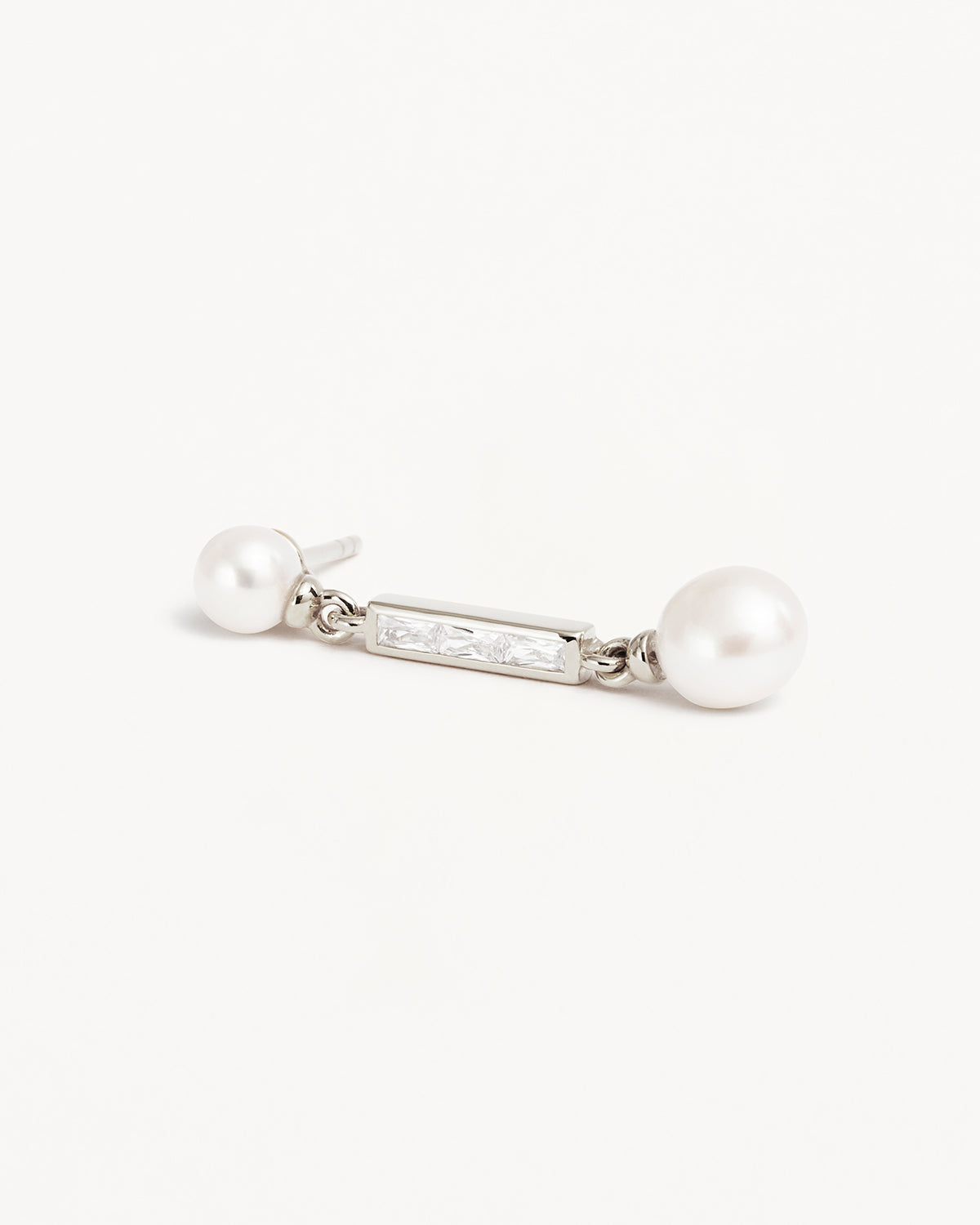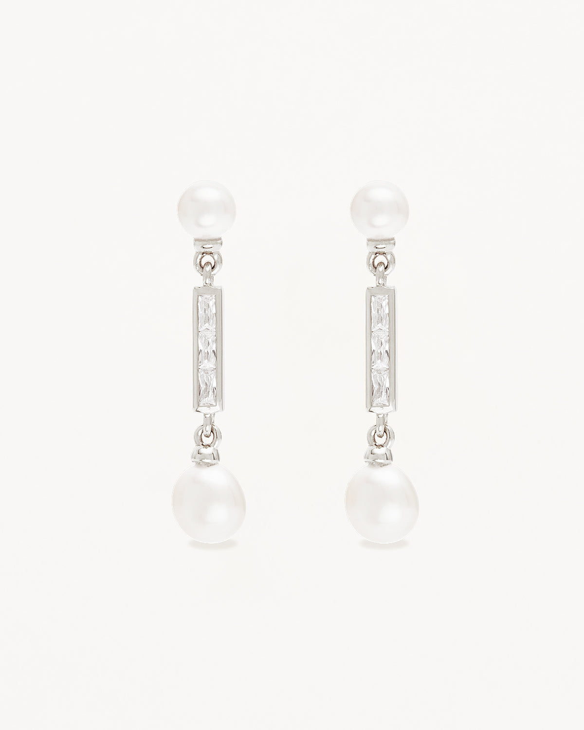 Carry calm confidence wherever you go with these Breathe Pearl Drop Earrings. Crafted in sterling silver, with option for yellow gold plate or white gold plate, rose gold plate. This keepsake features baguette cut crystals and round and baroque freshwater pearls in a drop earring style design. Wear this piece as a reminder that, when everything around you is in chaos, simply breathe.