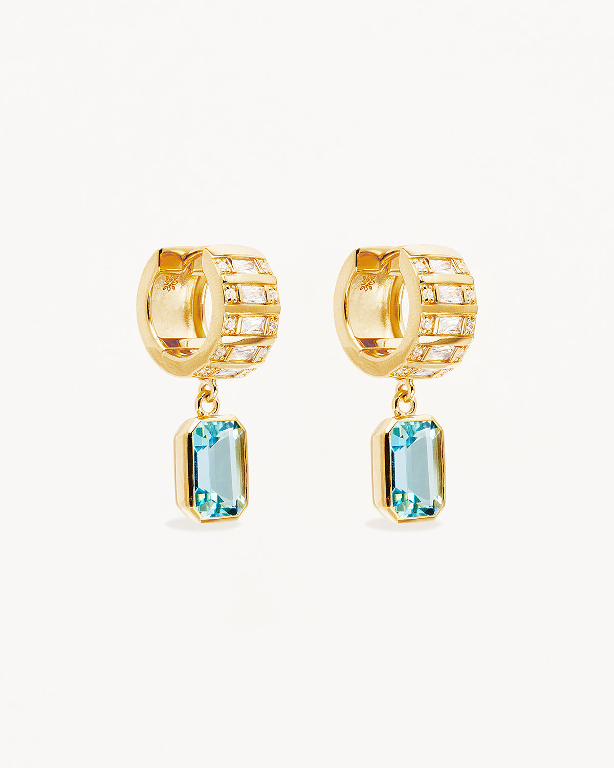 Embrace stillness and calm with our Calm Your Soul Topaz Earrings. This statement hoop features emerald-cut natural sky blue topaz framed by round and baguette cut crystals. Allow the soothing sky-blue topaz to bring peace and promote clarity in the chaos of everyday life.