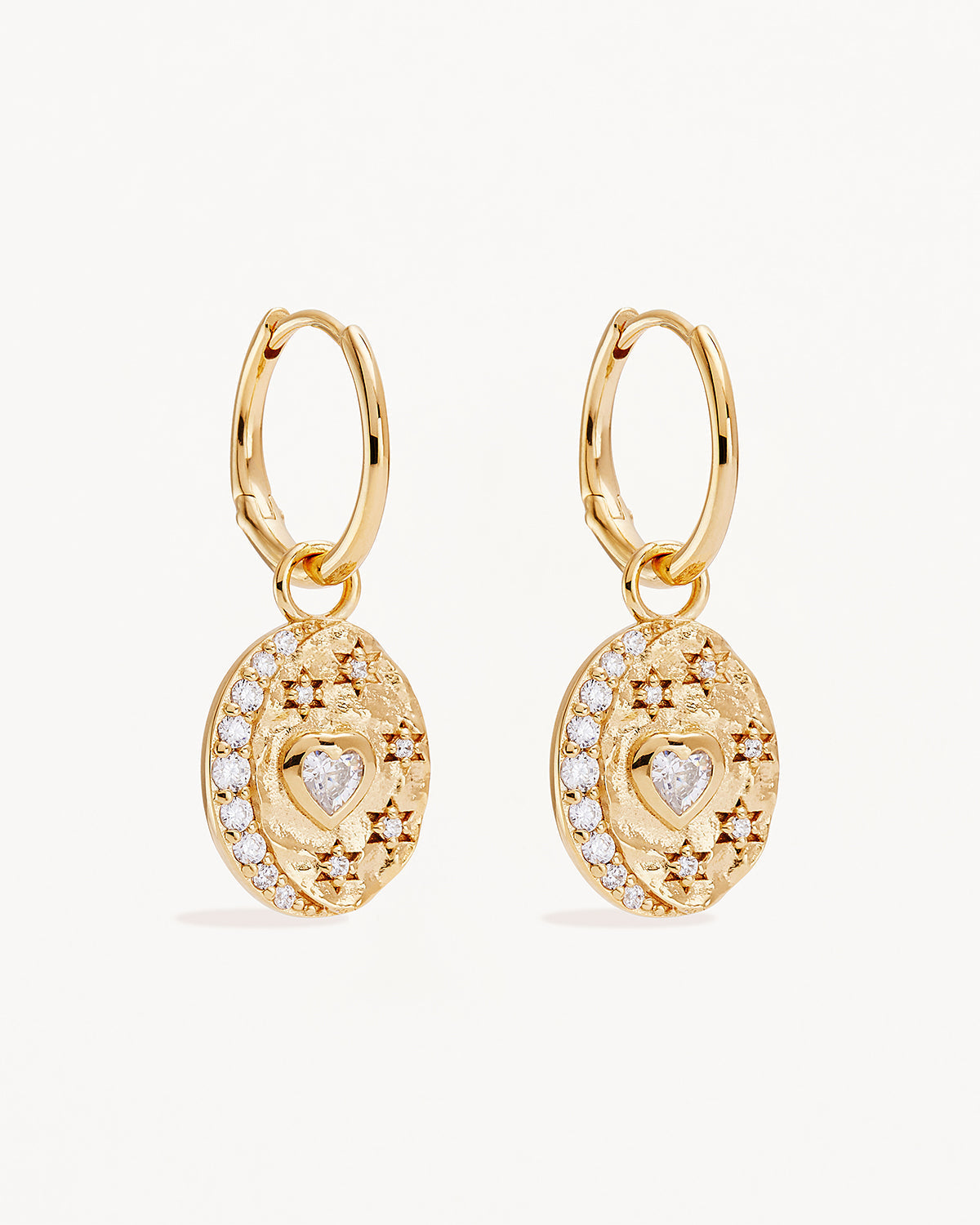 Adorned with a radiant heart and a sparkling crescent moon, these hoops reflect a love that reaches beyond the stars. Crafted in sterling silver, with option for yellow gold plate or white gold plate, rose gold plate.