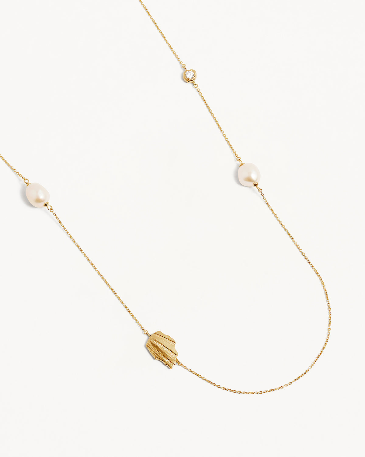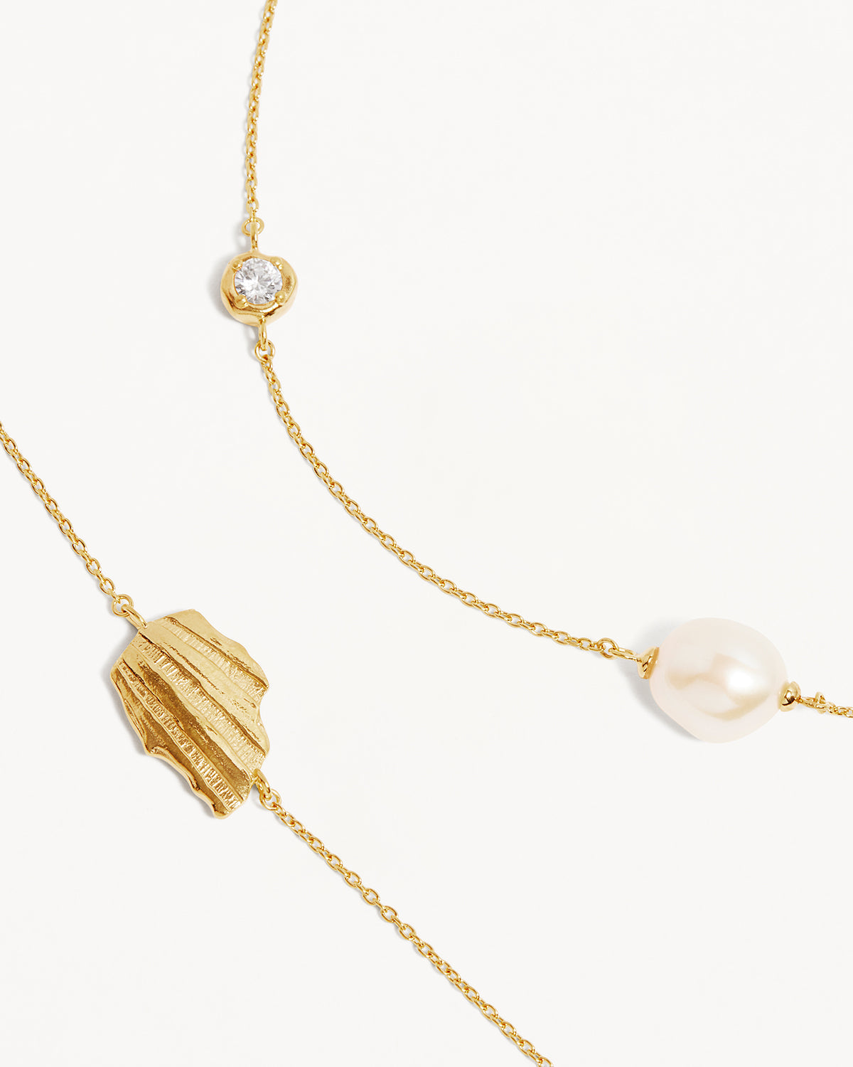 Our Moonlit Tides Necklace honours the relationship between the divine moon and the ocean. Crafted in sterling silver, with option for yellow gold plate or white gold plate, rose gold plate, this necklace is set with a sparkling crystal and baroque freshwater pearls. It can be worn wrapped around twice for a double layered necklace look, allowing you to embrace your divine power.