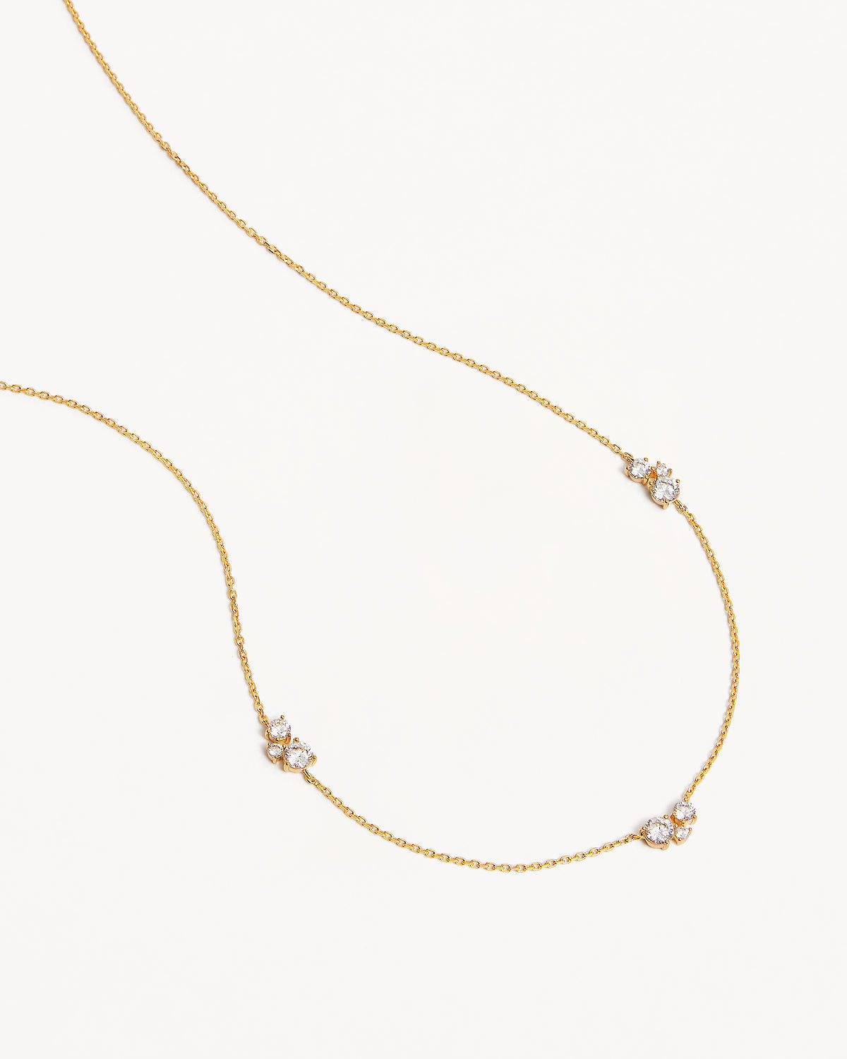 The Whispers of Love Choker features a classic trio design with an asymmetrical twist, showcasing varying sizes of round-cut crystals. This piece serves as a visual poem to the simplicity of love and the quiet magic it holds. Its classic and delicate design provides the perfect subtle touch of sparkle for brides looking to shine in their own light.