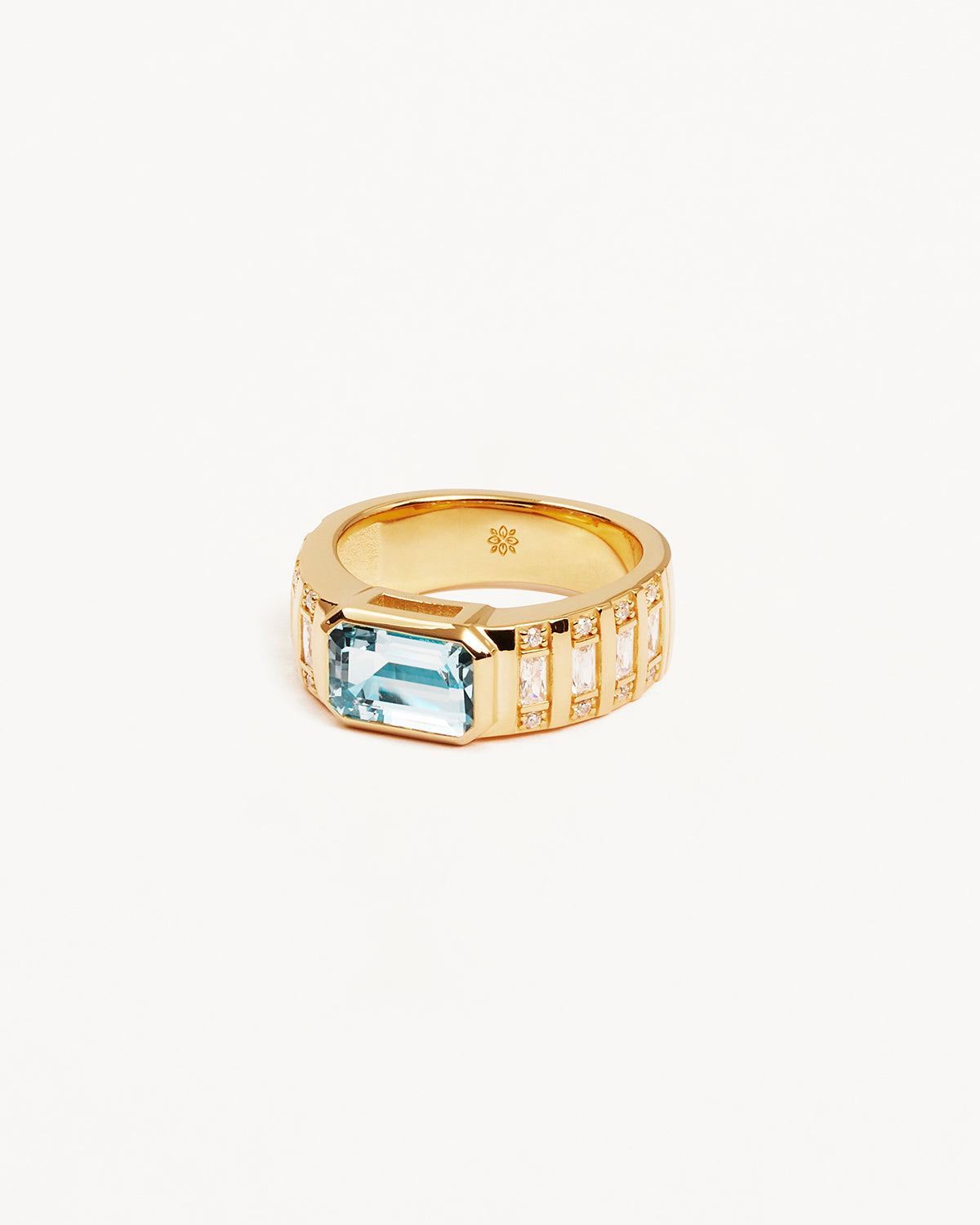 Harness the tranquil energy of blue topaz with this stunning Calm Your Soul Topaz Ring. This statement piece features an emerald-cut natural sky-blue topaz, elegantly framed by round and baguette cut crystals, symbolizing serenity, truth, and inner peace.