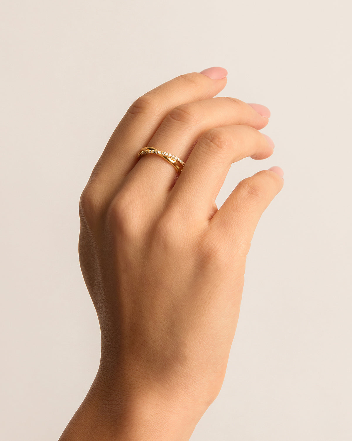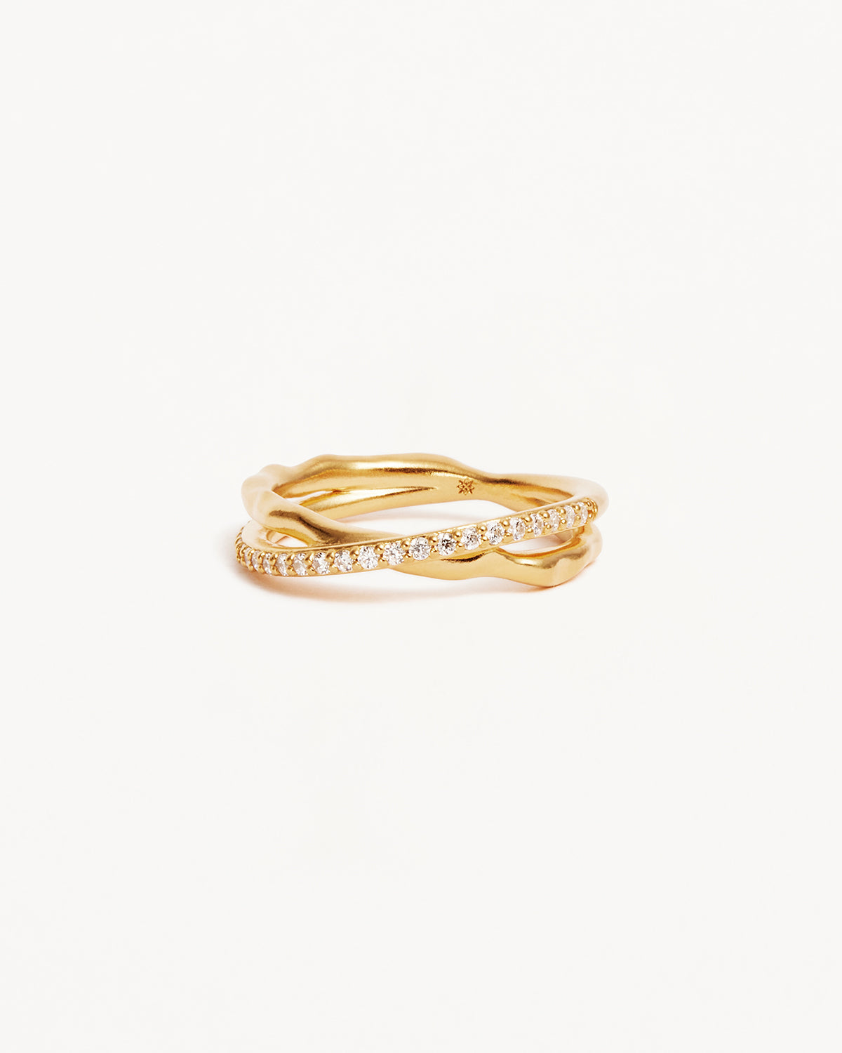 - Features a crystal embellished band intertwined with an organically shaped band.