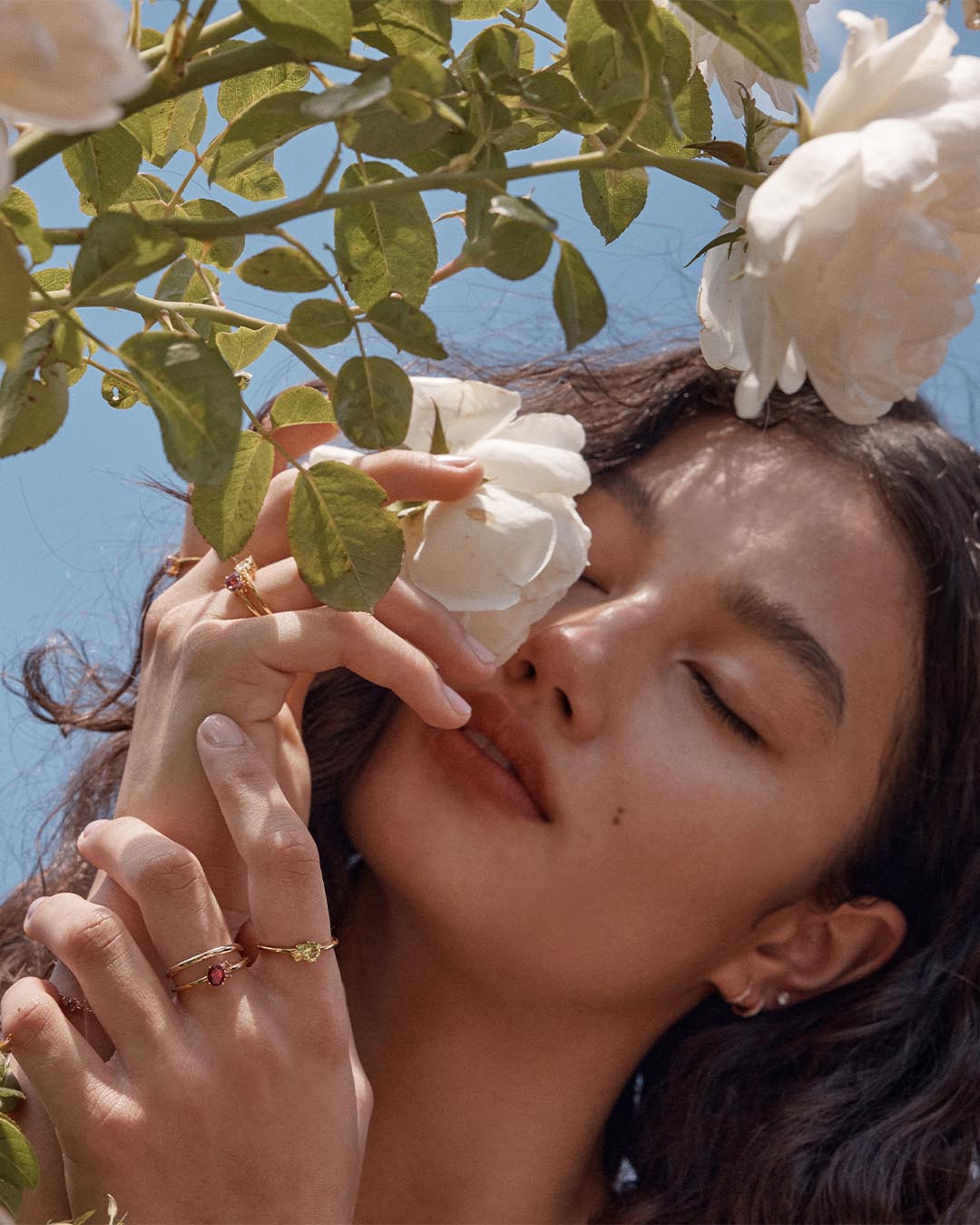 Gold Kindred July Birthstone Ring showcases a stunning cluster of ethically and sustainably sourced natural rhodolite and pink tourmaline. This subtle stacking ring embodies the vibrancy and magic of a rainbow, highlighting the connections that bring joy into our lives.
