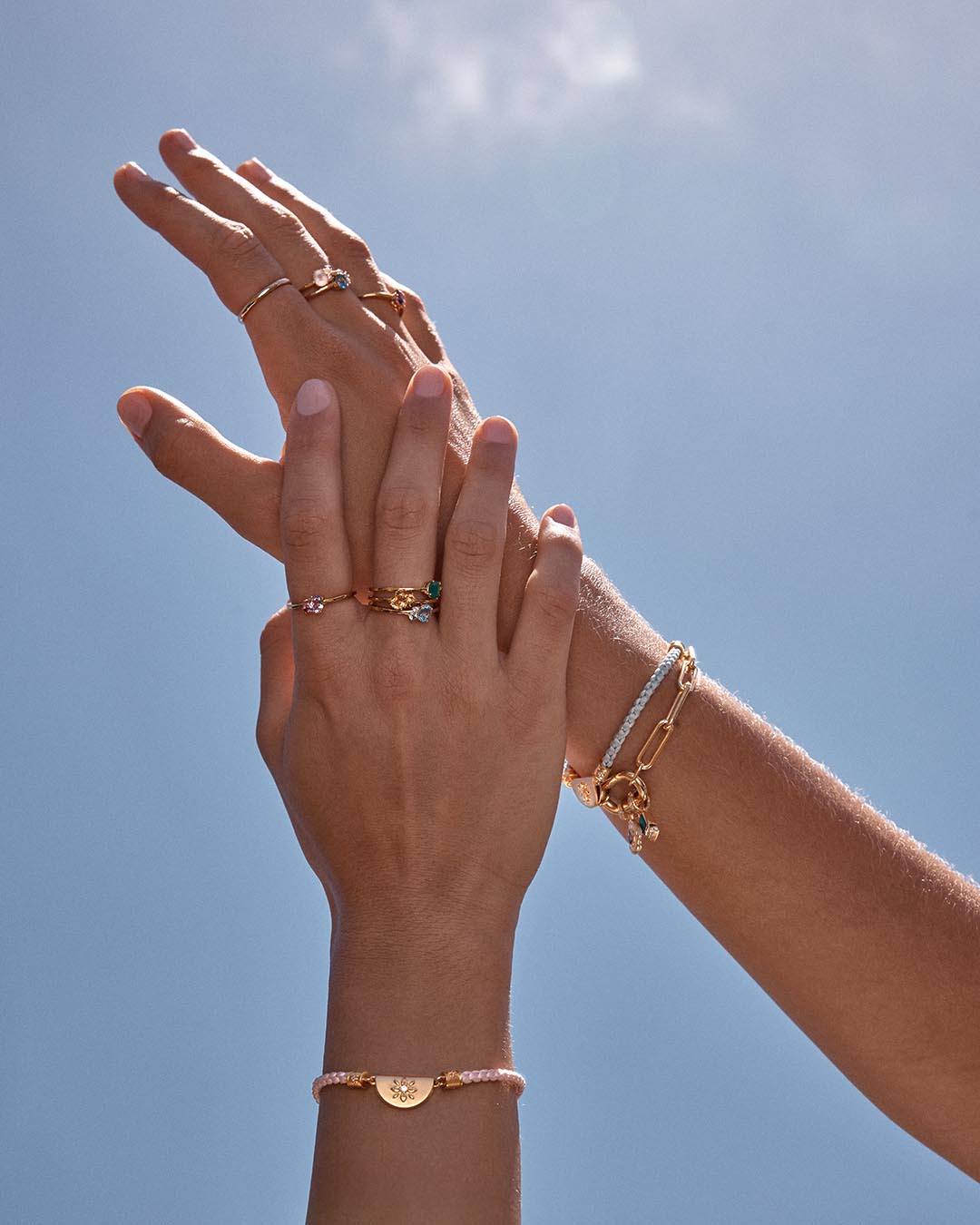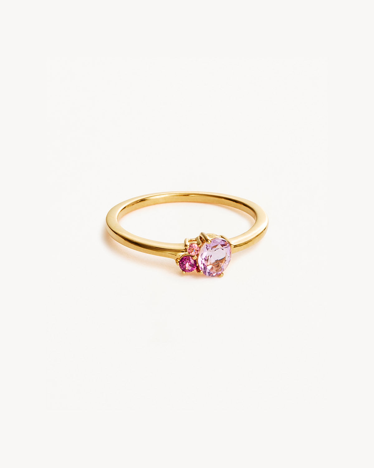 Our October Birthstone Ring features a kaleidoscopic cluster of ethically and sustainably sourced natural pink amethyst, rhodolite, and pink tourmaline. The October birthstone, pink tourmaline, is associated with love, compassion, and emotional healing; it is believed to inspire feelings of self-love and attract love from others. This subtle stacking ring mirrors the hues of a rainbow, representing the diverse connections that infuse joy into our lives.