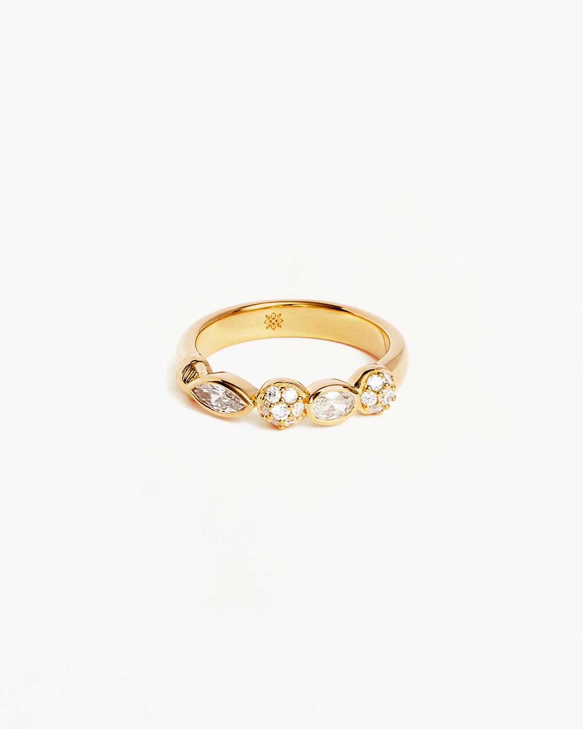 This ring can be paired with a collection of meaningful rings to create a stack of cherished keepsakes. Crafted in sterling silver, with option for yellow gold plate or white gold plate, rose gold plate.