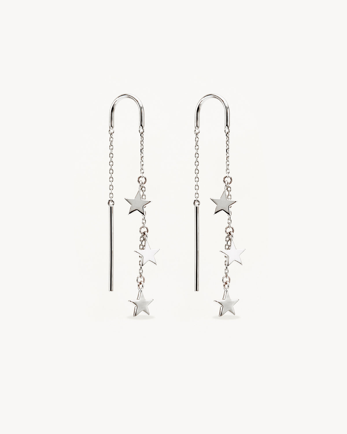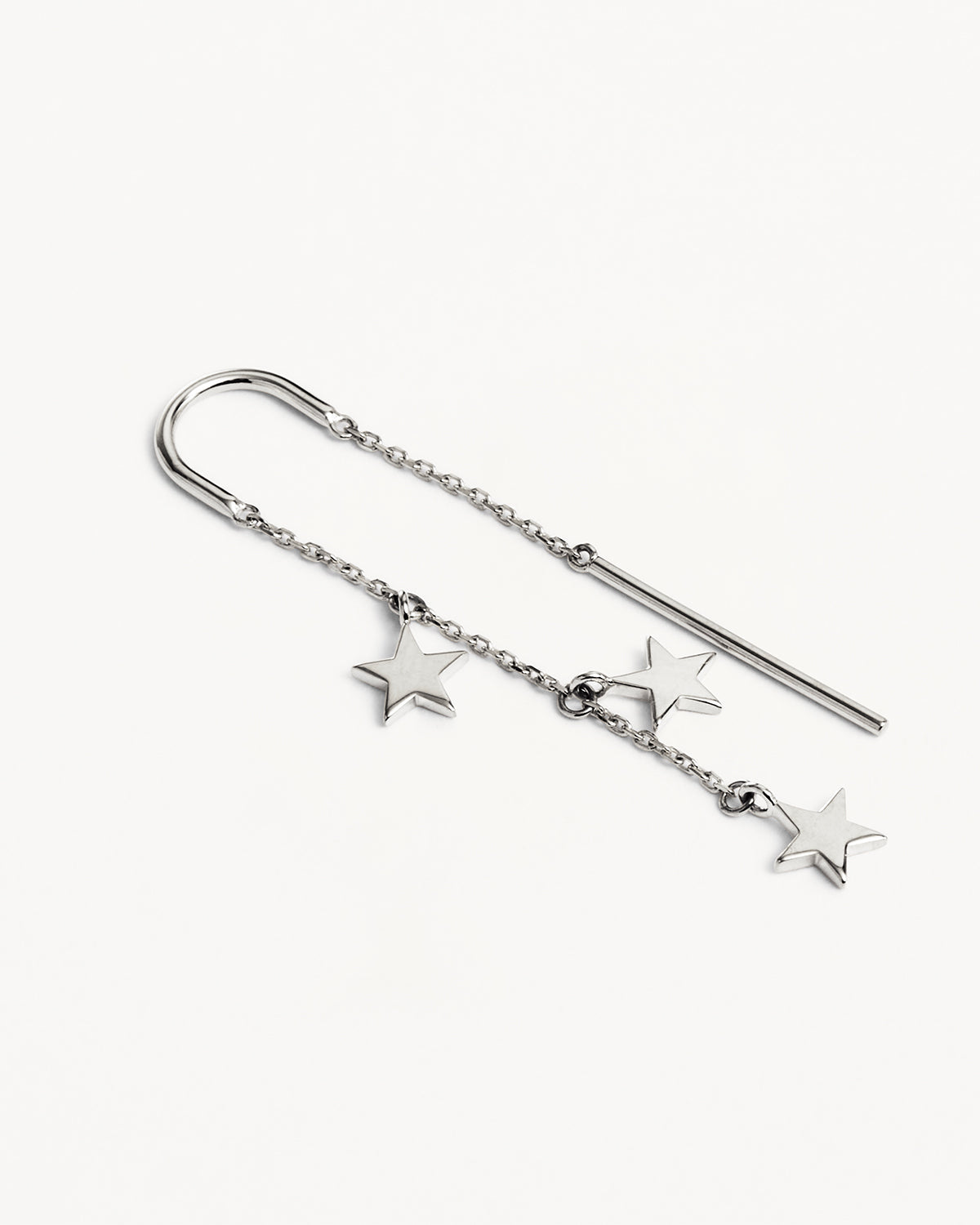 The perfect celestial ear curation piece, our Star Bright Thread Earrings are a reminder that the world is brighter because of your radiance. Crafted in sterling silver, with option for yellow gold plate or white gold plate, rose gold plate, these earrings feature three stars set on a signature diamond cut cable chain. They drop delicately past the ear, catching the light wherever you go. Shine unapologetically in this forever piece, just as the stars do.