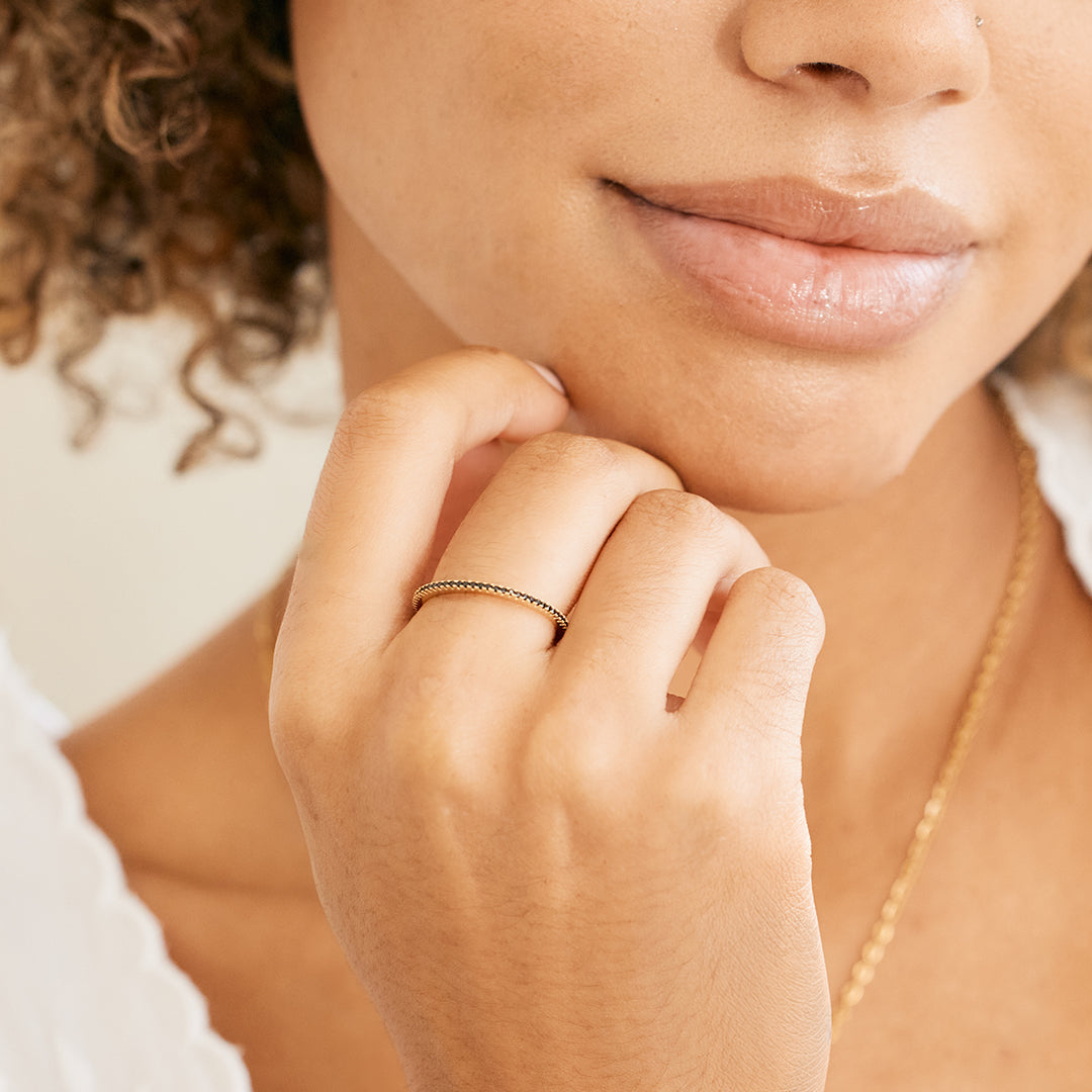 Crafted in sterling silver, with option for yellow gold plate or white gold plate, rose gold plate. The ring's band width is a delicate 1.3mm, making it a refined choice that can be worn alone for a subtle statement or stacked with other rings for a more dramatic effect. The slender band ensures comfort for daily wear while maintaining a strong presence on the hand.
