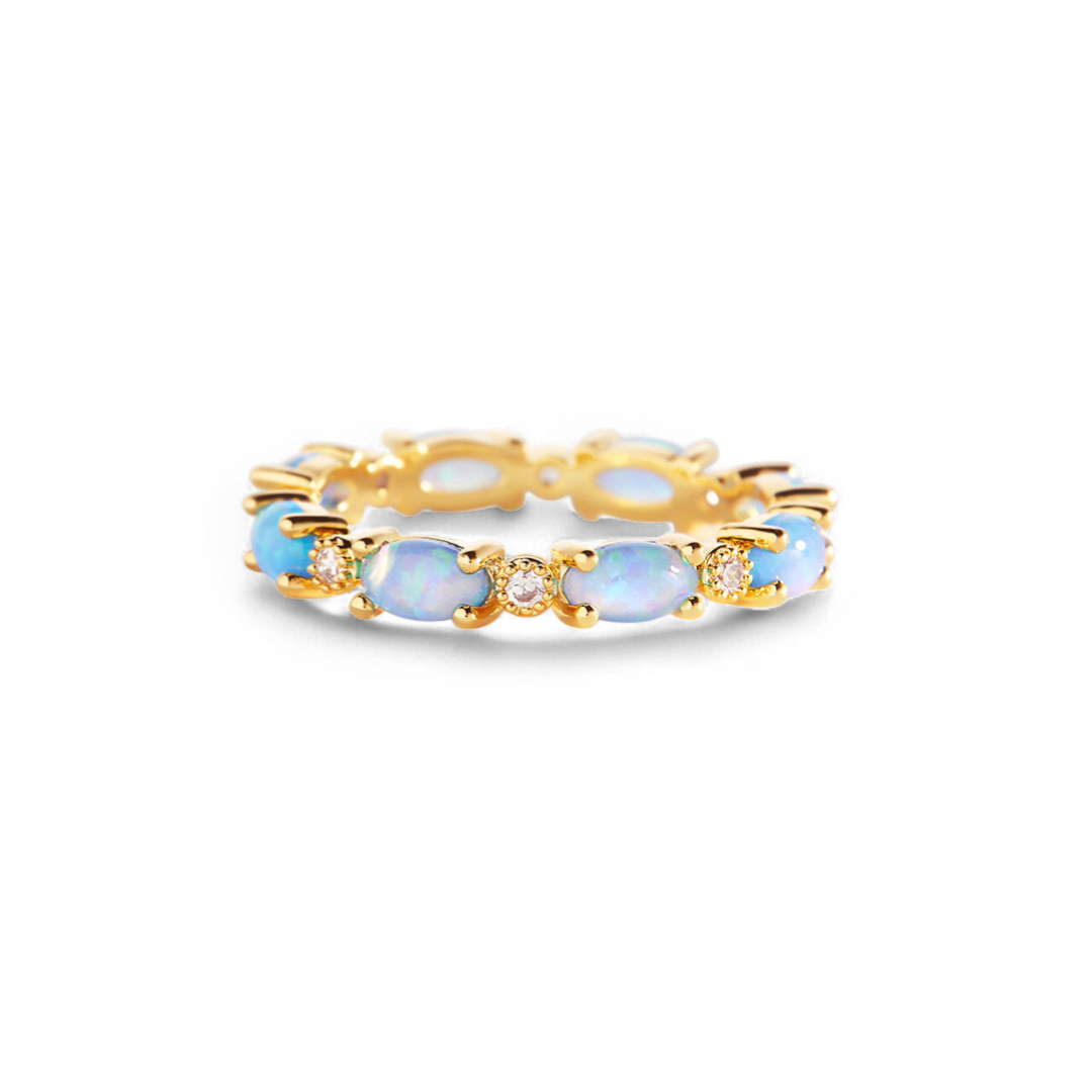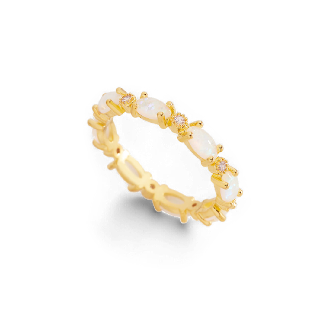 This stunning ring features a continuous circle of brilliantly colored fire opals, symbolizing everlasting love and passion. Perfect for those seeking a bold statement piece or a meaningful anniversary gift.