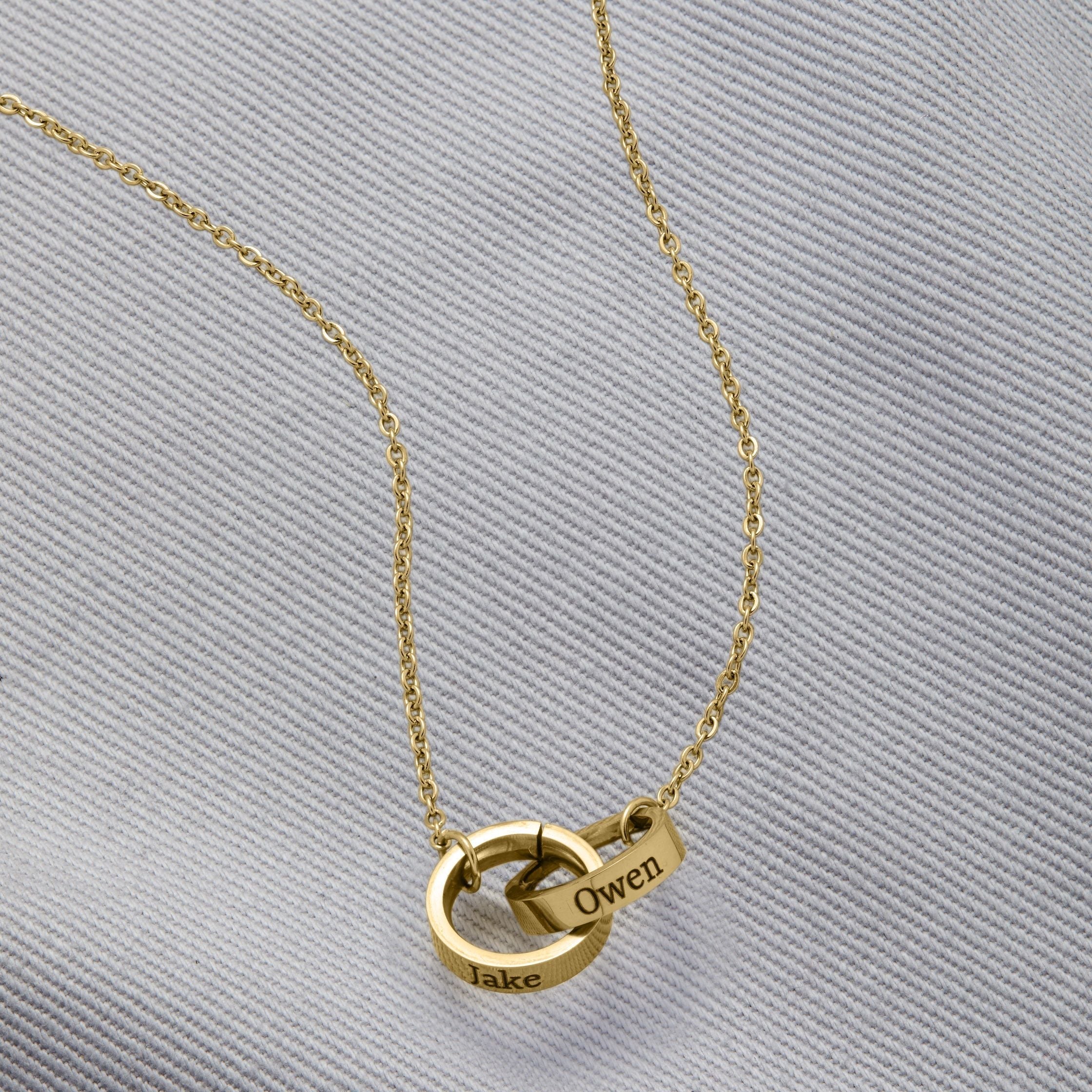 This two-ring design necklace allows you to personalize two different names that you cherish, keeping them close to your heart.