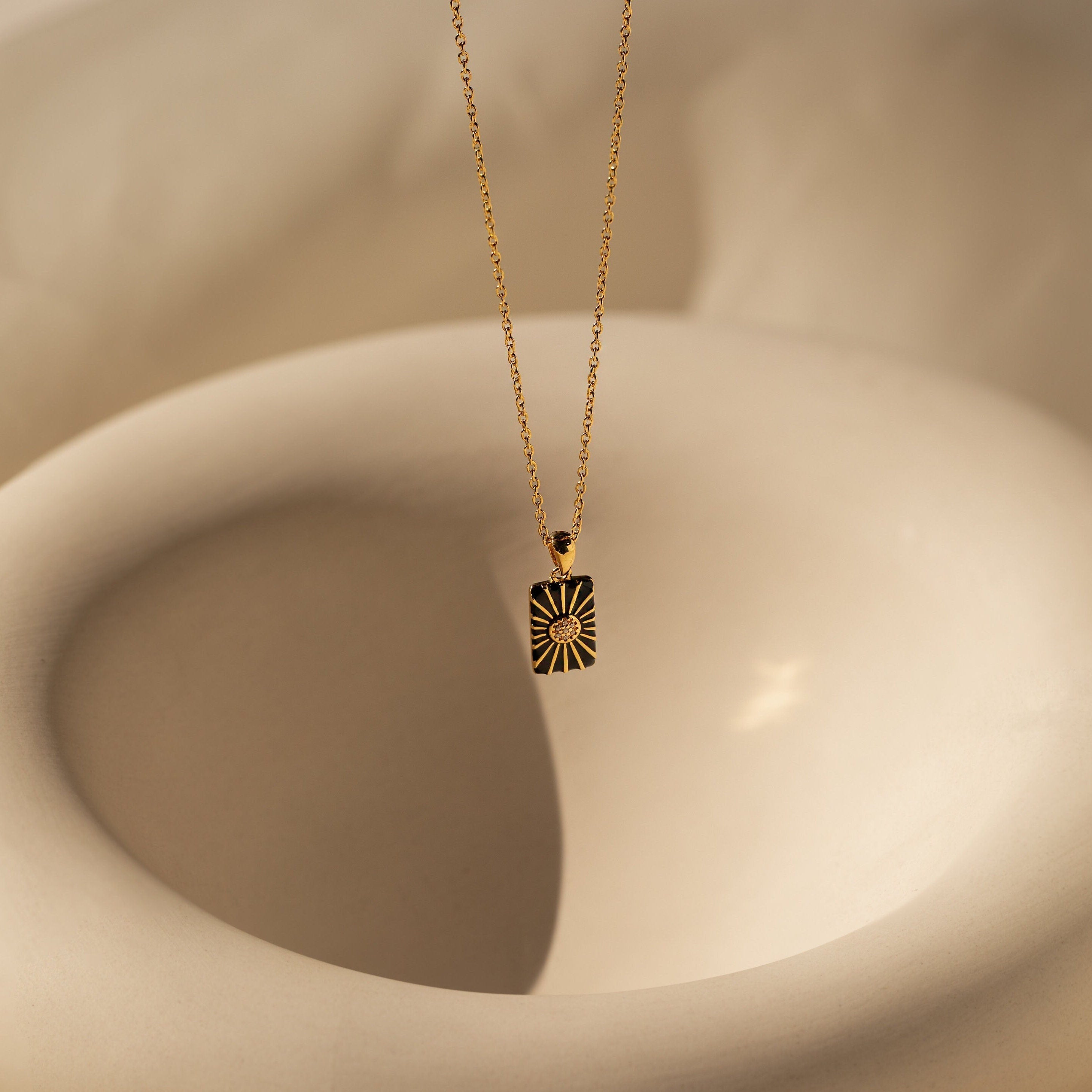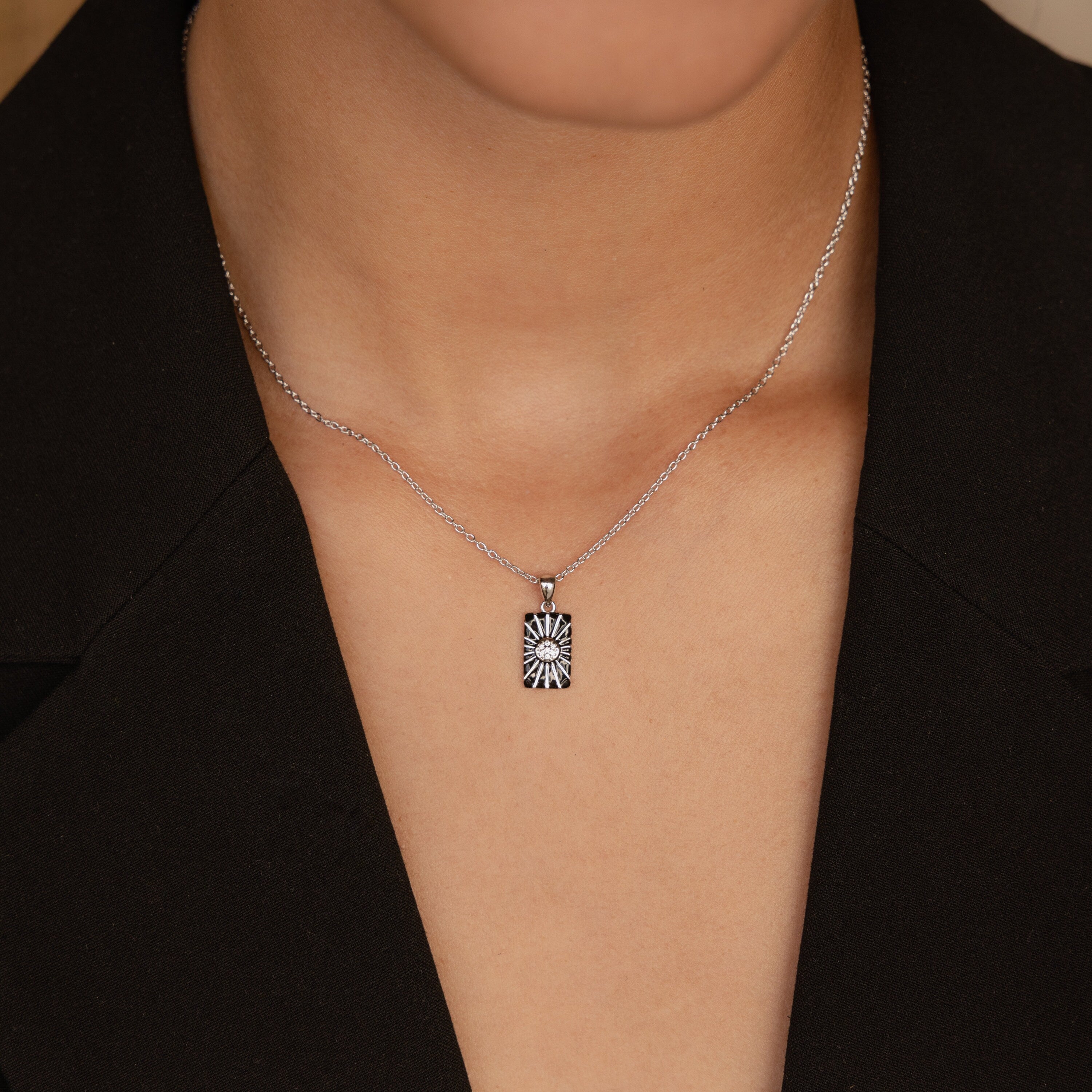 • Sun-Inspired Design: A delicate rectangular tag pendant with pave-set CZ diamonds for a radiant shimmer.